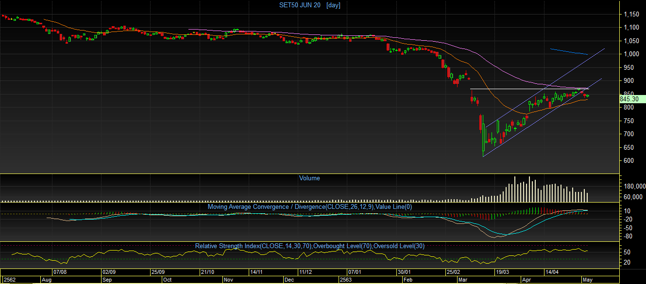 S50M20 TF Day: เมื่อสัปดาห์ที่ผ่านมา ดัชนีได้ทะยานขึ้นไปยืนเหนือระดับ 860 จุด และท้ายที่สุดแล้ว ก็ไม่สามารถยืนเหนือได้สำเร็จ และเผชิญกับแรงเทขายทำกำไร ร่วงหลุดแนวรับ Support line ลงมา ซึ่งเป็นการยืนยันรูปแบบแท่งเทียน “One close price reversal at top” และทำให้มองเป็นรูปแบบกลัวตัว “Double Top” ถ้าหากวันนี้ดัชนียังไม่สามารถฟื้นตัวขึ้นไปได้ พร้อมกับiร่วงหลุดเส้น EMA25 วัน ลงมา มีความเป็นไปได้สูง ที่ดัชนีกำลังจะเข้าสู่โหมด “พักฐาน” อีกครั้ง //แต่ถ้าหากฟื้นตัว ก็มีโอกาสที่จะกลับไปทดสอบระดับ 860 จุด