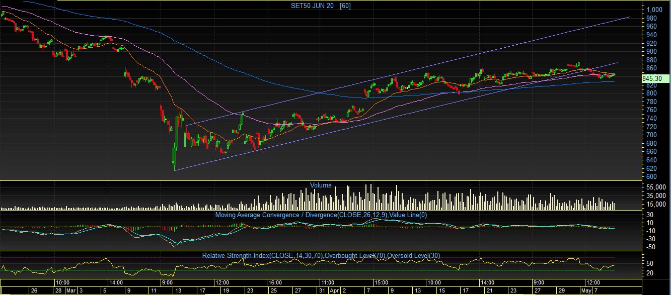 S50M20 TF60 Min: เป็นเวลาเนิ่นนานมาแล้ว ที่ดัชนียังคงเคลื่อนไหว Sideways up ขึ้นมาเรื่อยๆ จนกระทั่งได้มายืนเหนือ ระดับ 860 จุด อย่างไรก็ตาม ด้วยสัญญาณ Bearish Divergence ที่ปกคลุมไว้ก่อนหน้านี้ ได้ทำให้ดัชนีเผชิญแรงเทขาย ร่วงหลุดกรอบ แนวรับล่าง ของ “Uptrend channel” ลงมาเรียบร้อย อย่างไรก็ตาม การเคลื่อนไหวของแท่งเทียน ยังไม่เสียรูปทรง โดยพยายามประครองตัว ในรูปแบบ Sideways ออกข้าง ซึ่งต้องมาดูกันว่า ท้ายที่สุดแล้วดัชนี จะเลือกทางเดินไปในทิศทางใด หากฟื้นตัว ก็เป็นได้ว่า จะกลับไปทดสอบระดับ 860 จุด อีกครั้ง แต่ถ้าหากหลุดเส้น EMA200 วัน ลงมา ก็มีความเป็นไปได้สูงที่ดัชนีจะเข้าสู่โหมดพักฐานอีกครั้ง