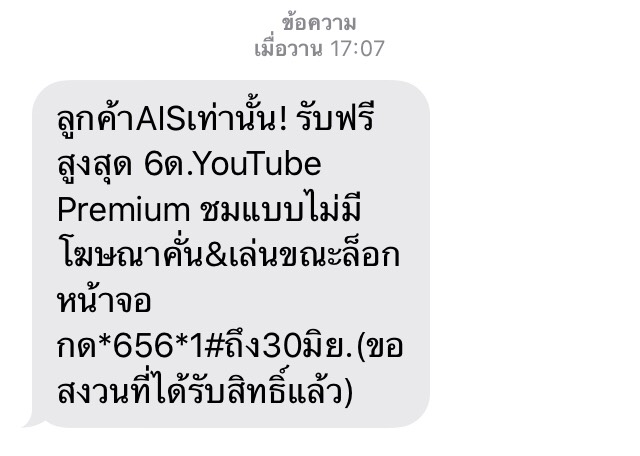 สวัสดีค่ะ พอดีได้ข้อความ ‘คุณได้รับสิทธิ์สมัครใช้บริการ YouTube Premium ฟรี! นาน 2 เดือน สนุกกับวิดีโอที่ชอบแบบไม่มีโฆษณาคั่น (เดือนที่ 3 จ่ายในราคาปกติ 179 บาทต่อเดือน) กดรับสิทธิ์ที่ *545*12#