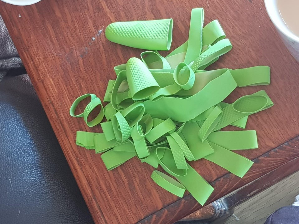 ส่วนที่เป็นปลอกนิ้วของถุงมือ เป็นส่วนที่ผิวยางบางที่สุดและเสี่ยงกับการปริขาดมากที่สุด และเป็นจุดสำคัญที่หากขาดแล้วจำเป็นต้องทิ้งถุงมือยางลงถังขยะไป แต่จริงๆ ส่วนนี้สามารถนำมาใช้งานได้อีก เช่น การนำมาครอบอุปกรณ์ใช้งานบ้านกันการเลื่อนไหลและป้องรอยจากการกระแทกได้ อาทิ ทำปลอกสวมด้ามไม้กวาด ด้ามจับร่ม หรืออุปกรณ์ทำสวนอย่าง จอบ เสียม ซึ่งมักจะพิงไว้ตรงผนัง ผิวยางมีแรงเสียดทานจะช่วยให้อุปกรณ์ไม่เลื่อนขยับ เป็นต้น