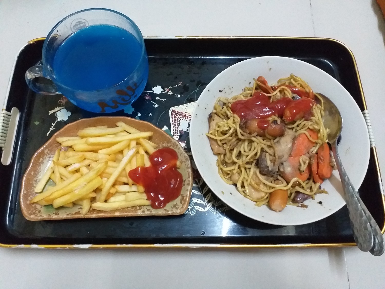มีขนมจีนแกงเขียวหวานเนื้อและไก่ จัดเขียวหวานเนื้อมา 1 จาน กับผัดหมี่ชมพูอีก 1 จาน ต่อท้ายด้วย ไอศครีมอีก 1 ถ้วย อิ่มแน่นมากจุกๆ