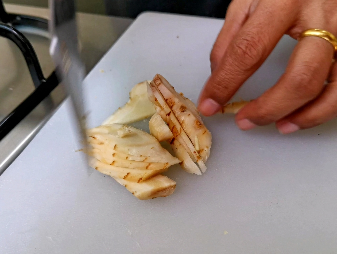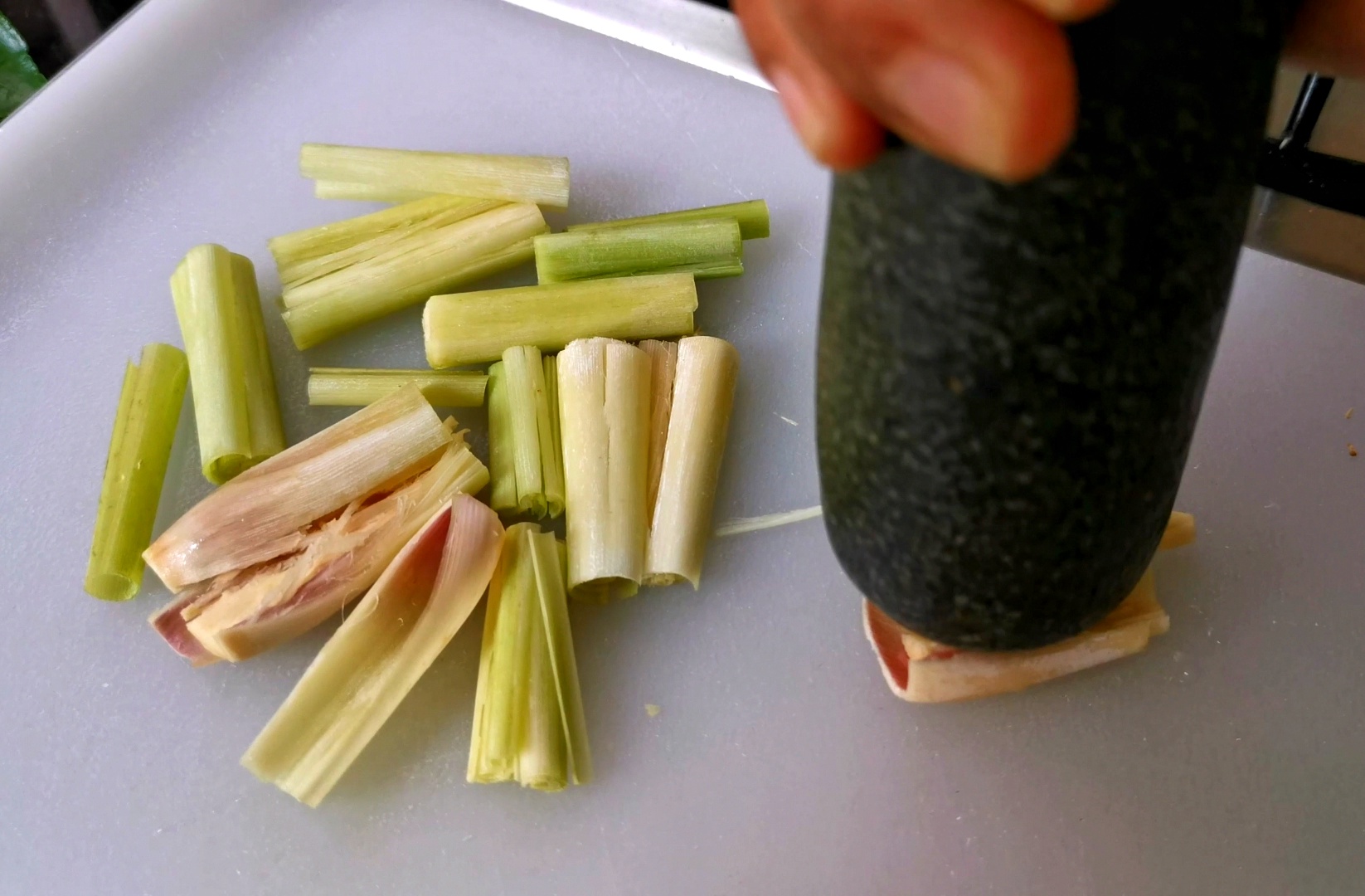 - นำ ตะไคร้, ข่า, หอมแดง มาหั่นและทุบ และใส่ลงไปในหม้อ
