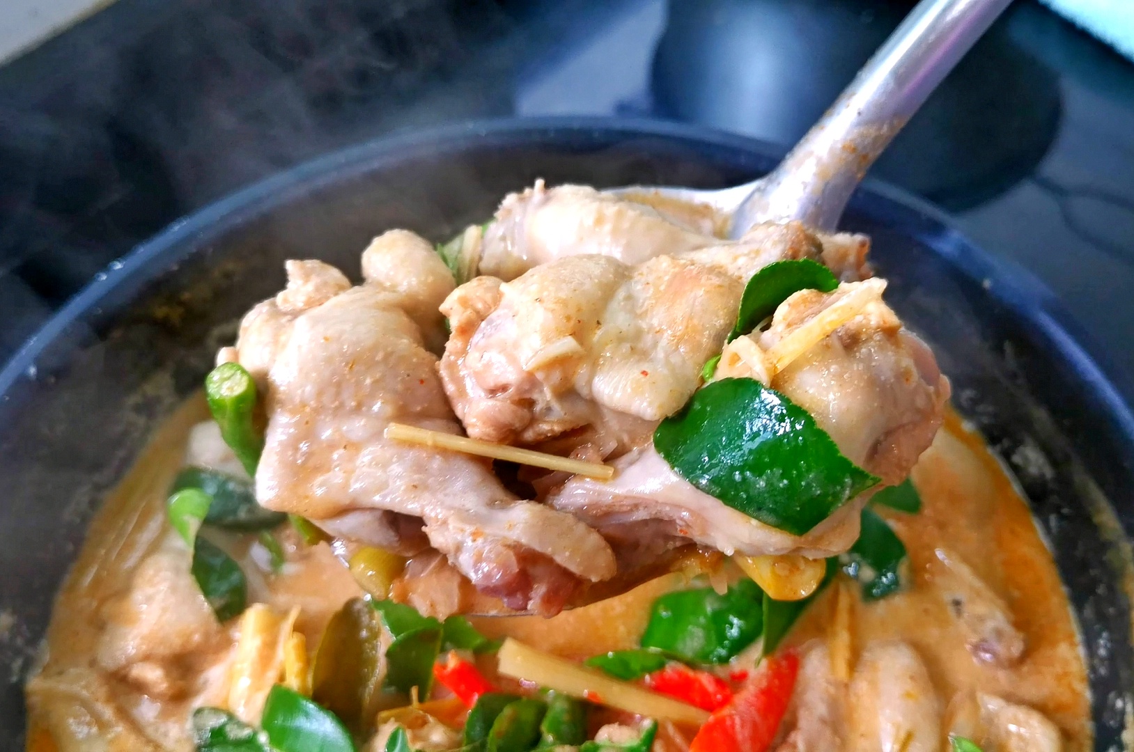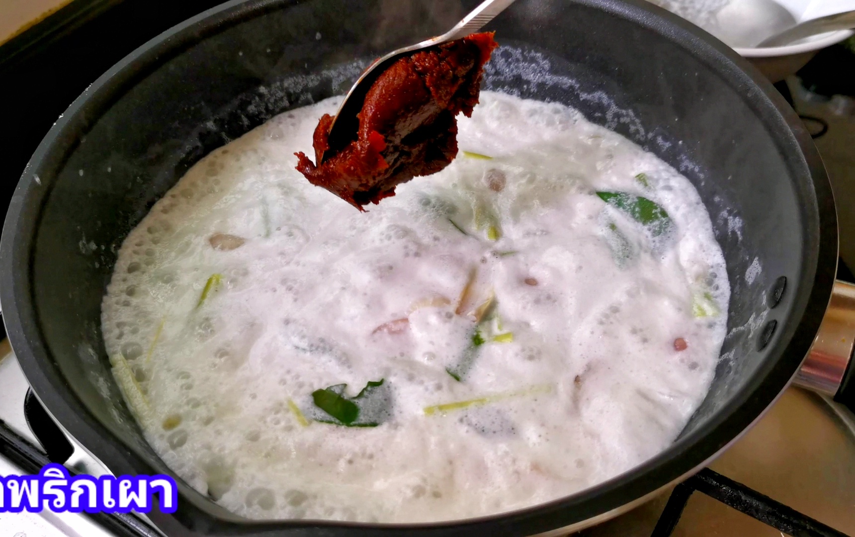 - ใส่น้ำเปล่าตามลงไป ต้มจนเดือด และใส่ใบมะกรูดลงไป