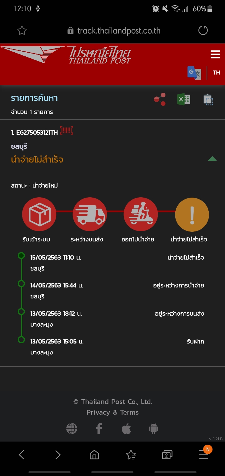พัสดุจาดไปรษณียืไทยขึ้นสถานะนำจ่ายไม่สำเร็จ