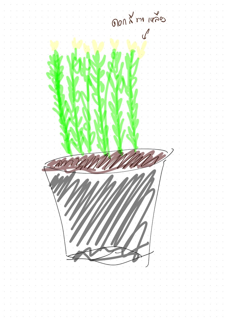 ปลูกในกระถางพลาสติกสีดำ ที่ปลายยอดมีดอกเล็กๆนิดเดียว ดอกเดียวสีขาวเหลือง