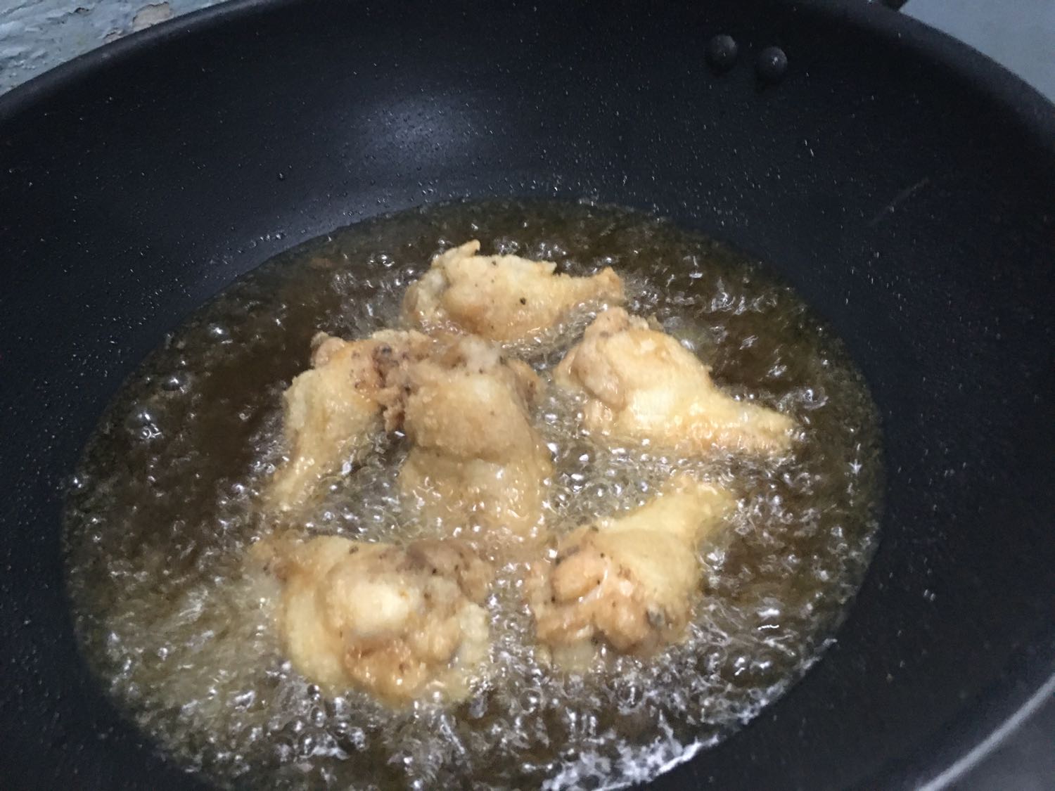 - ตั้งน้ำมันให้ร้อน พอร้อนแล้วเอาไก่ลงทอดไฟกลาง 8 นาทีให้เหลืองสวย ดับไฟ เอาไก่มาพักบนตะแกรง 4 นาที จุดเตาอีกครั้ง เอาไก่ที่พักไว้ลงทอดไฟแรง 3 นาที สะเด็ดน้ำมันแล้วคลุกซอสได้
