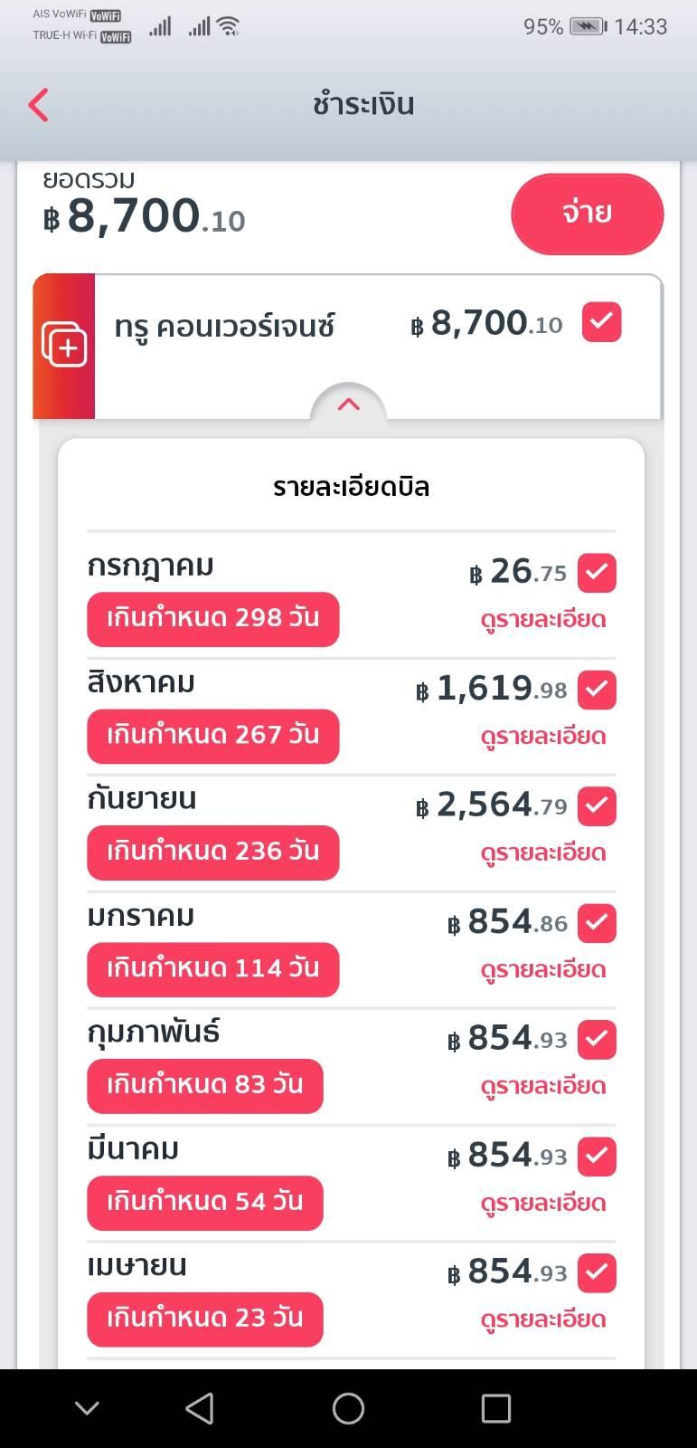 ตอนนี้มีบิลค้างชำระกับทรูเป็นจำนวน 8700.10โดยที่เราค้างไว้ตั้งแต่ กรกฏาคมปี จนถึงตอนนี้ เป็นยอดรวม8700.10 62ก่อนหน้านั้น(หลานเอาซิมที่แถมมากับบริการเน็ตบ้านไปสมัครบริการมั่วจนยอดพุ่งจากปกติค่าเน็ตเดือนละ8-900) ยอดพุ่งมาประมาณ4-5พัน เราก็ยังจ่ายแค่ค่าเน็ตปกติ ยอดที่สมัครบริการในซิมยังไม่ได้จ่าย แต่พอ มกราเราอยากเลิกใช้เน็ตบ้านของทรู เลยไปถามรายละเอียดเพื่อขอยกเลิกที่เค้าท์เตอร์ พนักงานบอกว่าให้เคลียร์ยอดที่ค้างก่อน ทางเรายังไม่พร้อม เลยยังไม่ได้ปิด แต่พอค้างค่าเน็ต1เดือน เราก็ใช้เน็ตไม่ได้อยู่แล้วเพราะโดนตัดสัญญาณ ตั้งแต่กุมภาพันธ์ก็ใช้เน็ตไม่ได้แล้ว แต่ค่าบริการมาไม่หยุด
