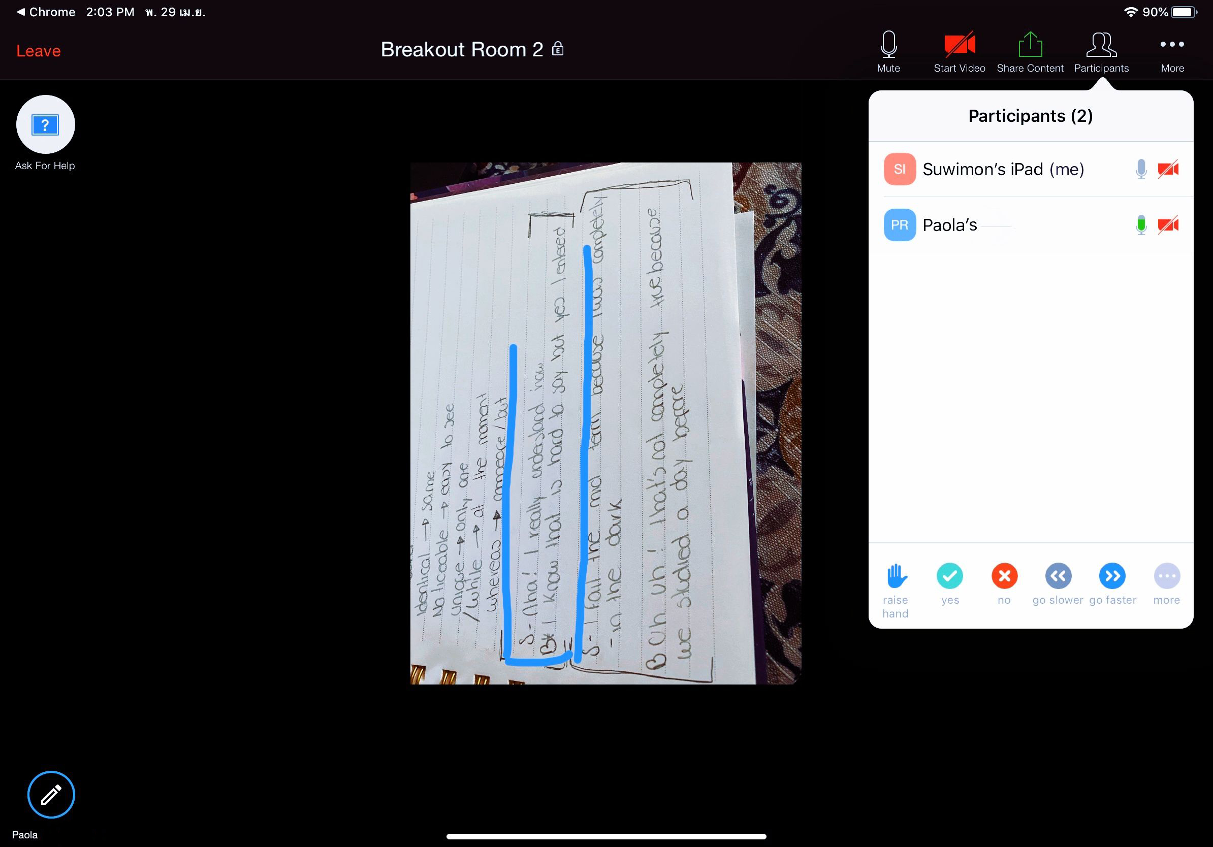 ภาพตัวอย่างเรียนออนไลน์ : อันนี้เป็นการแบ่งกลุ่ม 2 คน ในห้องย่อยของ ZOOM (เหมือนกับการแบ่งทำงานกลุ่มในห้องเรียนค่ะ)