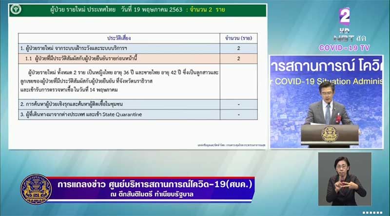 สำหรับรายงานสถานการณ์โควิด -19 ในประทศไทย วันนี้มีผู้ติดเชื้อใหม่ 2 ราย ผู้ติดเชื้อสะสม 3,033 ราย และผู้ป่วยที่ยังรักษาตัวอยู่ 120 ราย หายกลับบ้านแล้ว 2,875 ราย สำหรับผู้ติดเชื้อใหม่ 2 ราย เป็นผู้หญิงอายุ 36 ปีและชายไทอายุ 42 ปี ซึ่งงเป็นลูกสาและลูกเขยที่มีประวัติสัมผัสผู้ป่วยยืนยันที่โรงพยาบาลสุไหงโกลก จังหวัดนาธิวาส และเข้ารับการตรวจหาเชื้อในวันที่ 14 พ.ค. ทั้งนี้ขอให้ประชาชนมั่นใจว่าระบบควบคุมเรายังดีอยู่