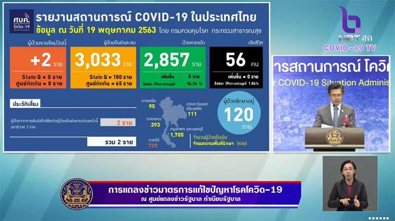 19 พฤษภาคม 2563 นพ.ทวีศิลป์ วิษณุโยธิน โฆษกศูนย์บริหารสถานการณ์การแพร่ระบาดของโรคติดเชื้อไวรัสโคโรนา 2019 (โควิด-19) หรือ ศบค.แถลงสถานการณ์ประจำวัน ว่า สถานการณ์การแพร่ระบาดในประเทศไทย มีผู้ป่วยรายใหม่ 2 ราย ทำให้มียอดผู้ป่วยสะสม 3,033 ราย หายป่วยสะสม 2,857 ราย ไม่มีรายงานผู้เสียชีวิตเพิ่มเติม ทำให้ยอดผู้เสียชีวิตสะสมยังคงอยู่ที่ 56 ราย อยู่ระหว่างรักษา 120 ราย