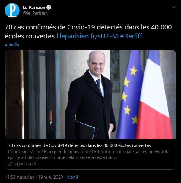 ฝรั่งเศส สั่งปิดโรงเรียนทางตอนเหนือ 7 แห่ง หลังพบผู้ติดเชื้อประมาณ 70 ราย เชื่อมโยงกับโรงเรียน ภายในสัปดาห์แรกจากมาตรการผ่อนคลายล็อคดาวน์ อนุญาตให้ 1 ใน 3 ของเด็กนักเรียนกลับไปเรียนที่โรงเรียนได้