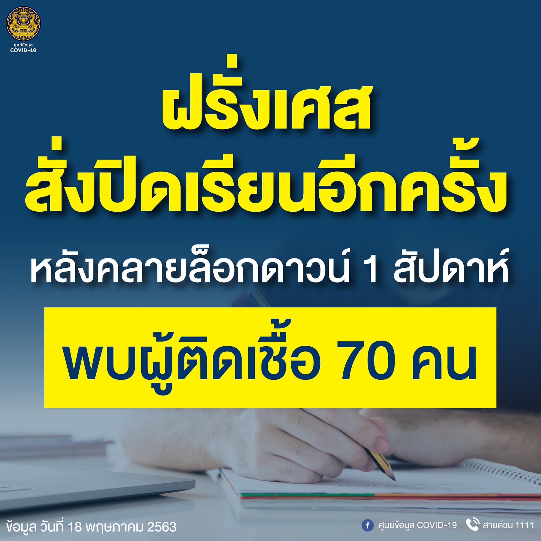 แต่มีข่าวไม่สู้ดีที่ฝรั่งเศส มีการติดเชื้อในโรงเรียน ที่คลายล็อคถึง 70 คน เป็นบทเรียนให้ไทยได้นำมาใช้อีกแล้วค่ะ จะเปิดอย่างไรให้ปลอดภัยที่สุด