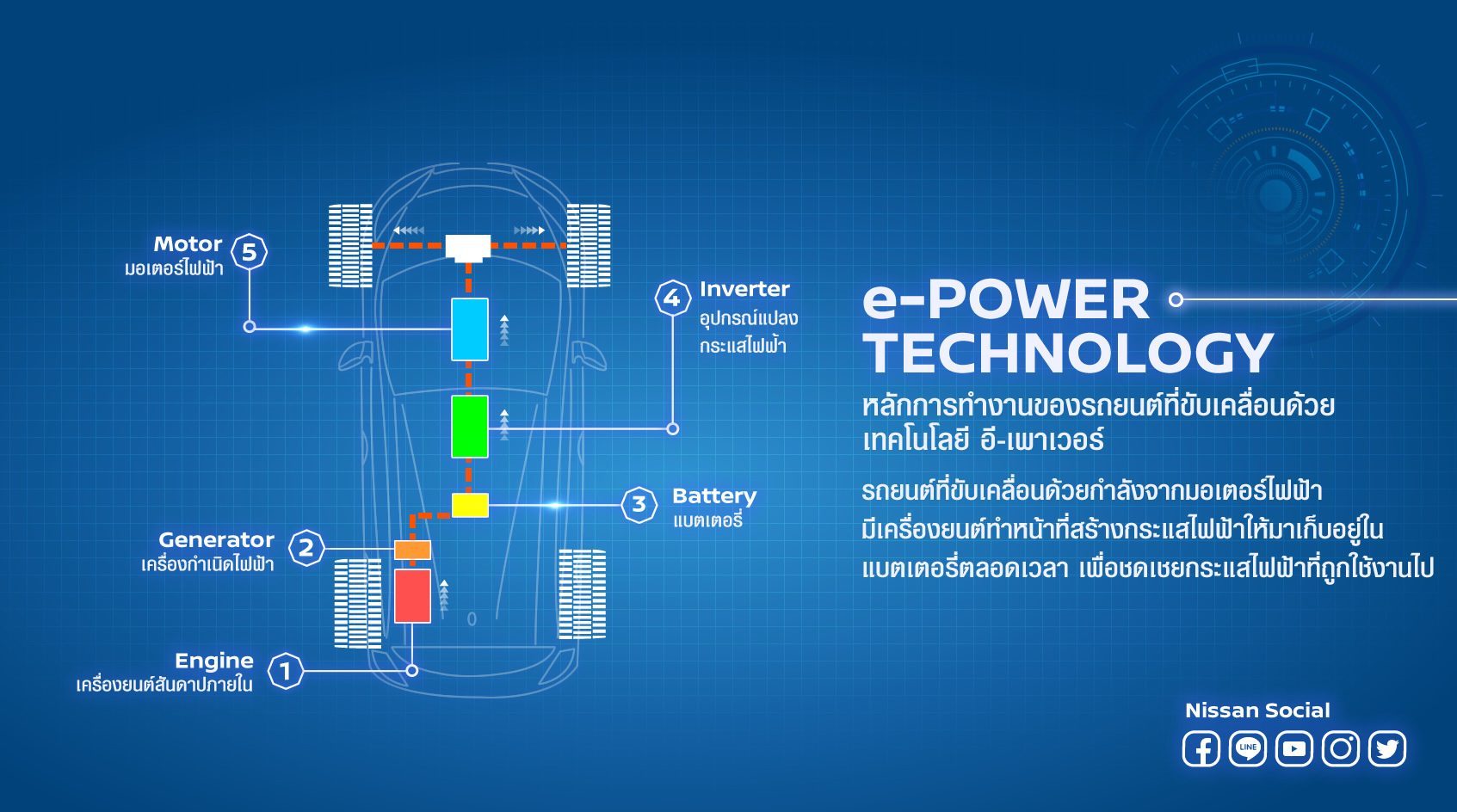 อี-เพาเวอร์ เทคโนโลยี ประกอบด้วยเครื่องยนต์สันดาปภายในที่ใช้น้ำมันเชื้อเพลิง, เครื่องกำเนิดไฟฟ้า (Generator), แบตเตอรี่ (Battery), อุปกรณ์แปลงกระแสไฟฟ้า (Inverter), และ มอเตอร์ไฟฟ้า (Motor) โดยรถยนต์จะถูกขับเคลื่อนด้วยกำลังจากมอเตอร์ไฟฟ้าเท่านั้น ซึ่งกระแสไฟฟ้าที่ถูกส่งมาให้กับมอเตอร์ไฟฟ้านั้น จะถูกเก็บอยู่ในแบตเตอรี่กำลังสูง โดยที่มีเครื่องยนต์สันดาปภายในทำหน้าที่ในการสร้างกระแสไฟฟ้าเข้ามาเก็บอยู่ตลอดเวลาเพื่อชดเชยกระแสไฟฟ้าที่ถูกใช้งานไป ขุมพลังแบบ อี-เพาเวอร์ (e-POWER) ให้แรงบิดในทันทีรวมถึงอัตราเร่งที่รวดเร็ว และแรงบิดที่นุ่มนวล