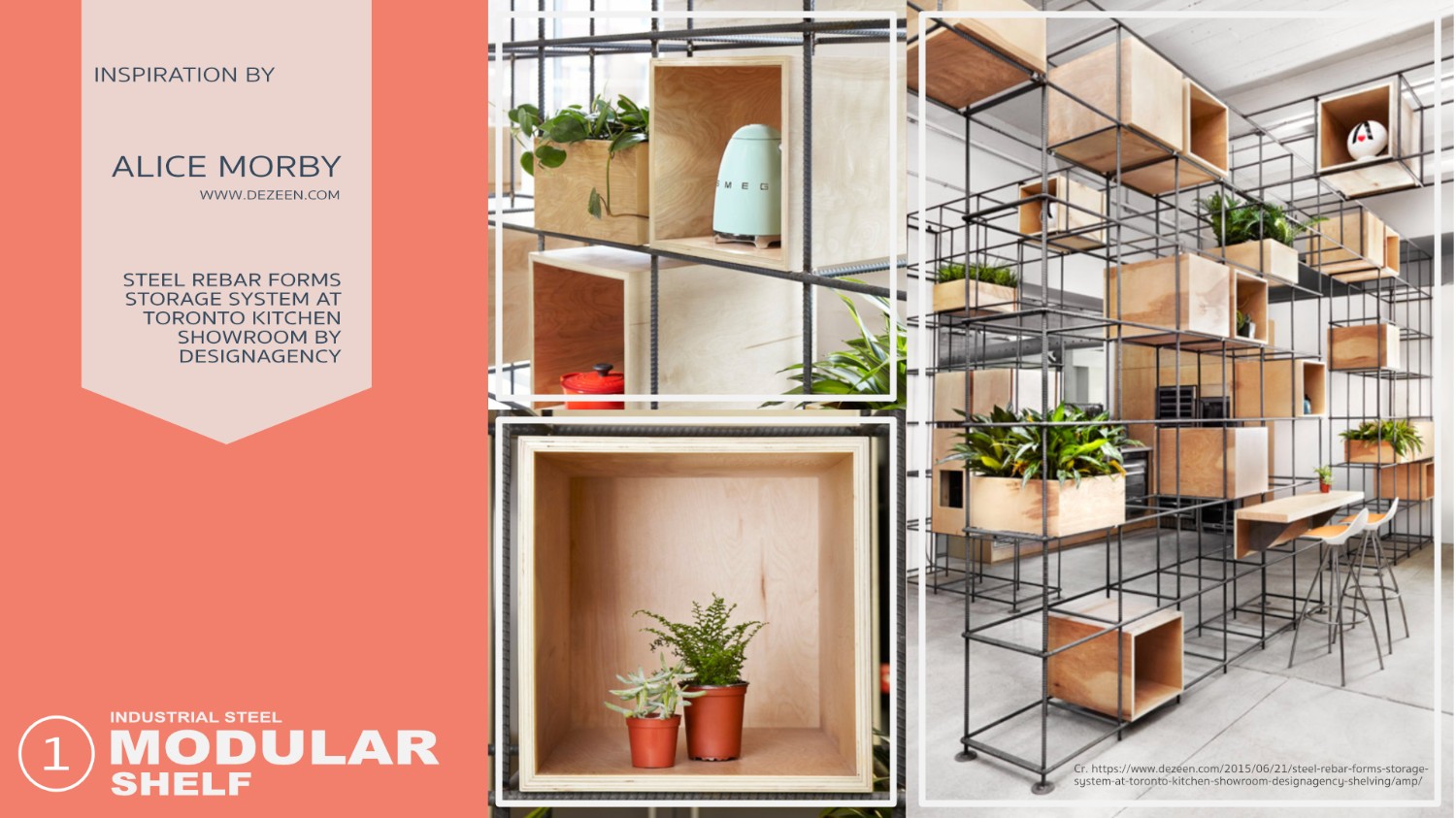 ชั้นวางของโครงสร้างเหล็ก ได้รับแรงบัลดาลใจจากร้านกาแฟ หรือ คาเฟ่ ที่เราเคยไปสัมผัสมา โดยส่วนตัวรู้สึกชอบกับการออกแบบลักษณะนี้เป็นพิเศษ เหตุผล คือ เราสามารถปรับเปลี่ยนชั้นต่างๆด้วยตัวเราเองได้ตลอด พื้นที่ว่างๆ สามารถวางตอนไม้เพื่อเพิ่มพื้นที่สีเขียวให้กับห้องและโครงสร้างเหล็กนั้นมีความแข็งแรงกว่าไม้ทำให้สามารถรับน้ำหนักได้ตามความต้องการของเรา แน่นอนว่าตอบโจทย์ของเราค่อนข้างครบ
