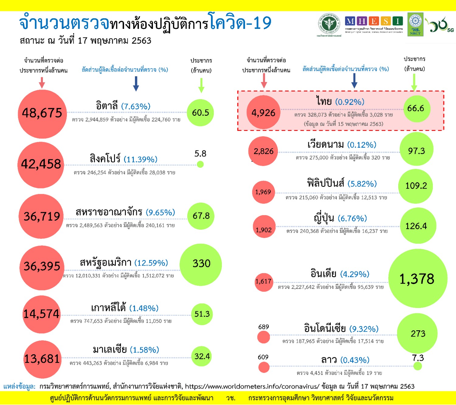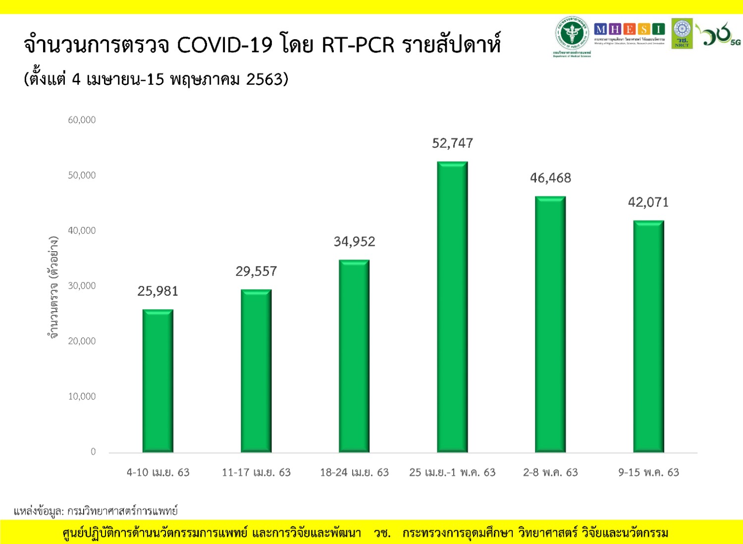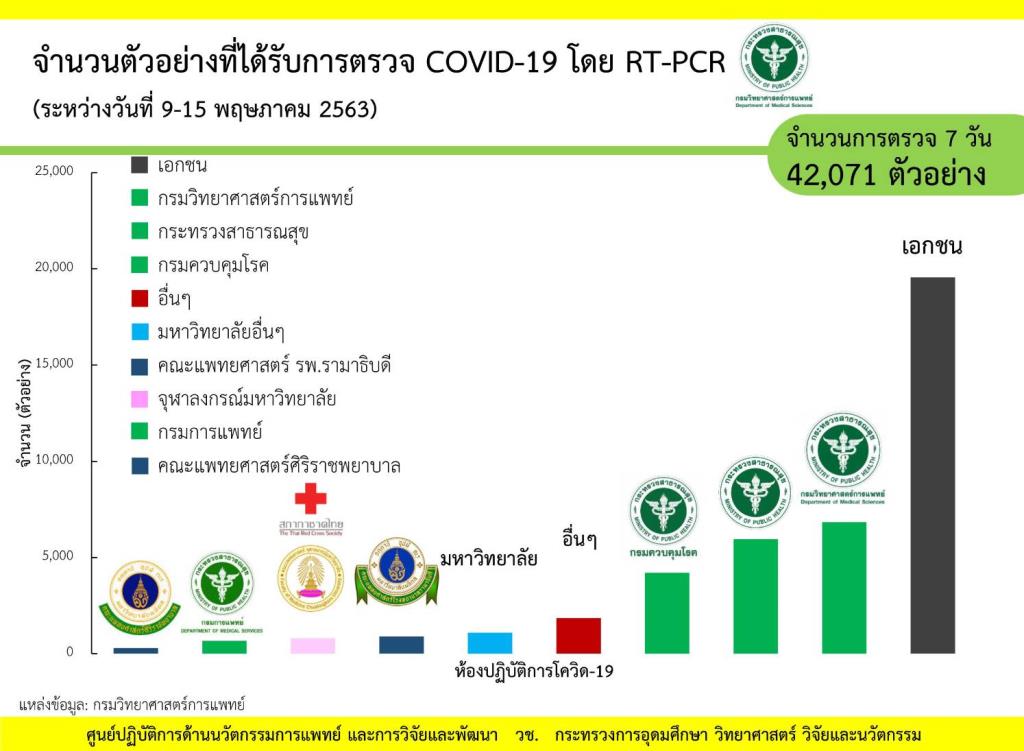 ในระหว่างวันที่ 9-15 พฤษภาคม 2563 ได้ตรวจไปแล้ว 42,071 ตัวอย่าง โดยห้องปฏิบัติการที่ได้รับการรับรองจากกรมวิทยาศาสตร์การแพทย์ทั่วประเทศ
