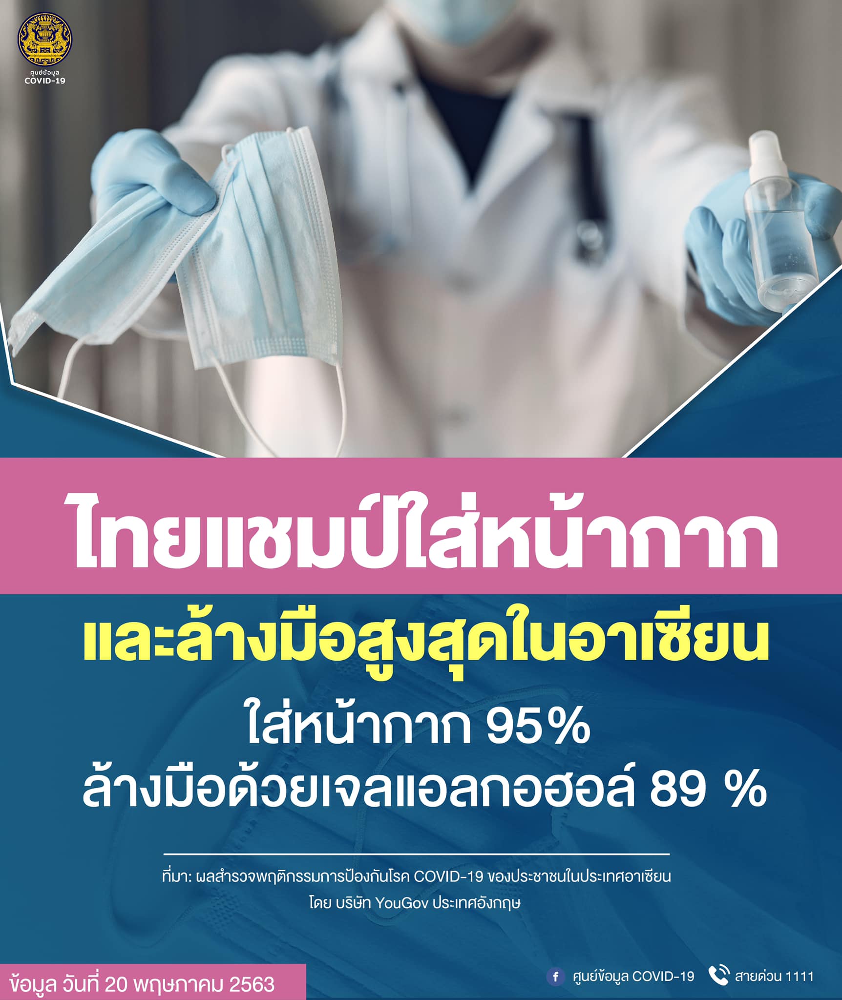 นพ.ทวีศิลป์ วิษณุโยธิน โฆษก ศบค. ระบุว่า วันนี้ (20 พ.ค. 63) ไทยมีผู้ป่วย COVID-19 ใหม่เพิ่ม 1 คน รวมสะสม 3,034 คน หายป่วยเพิ่มขึ้น 31 คน รวม 2,888 คน ไม่มีผู้เสียชีวิตเพิ่มคงที่ 56 คน รักษาอยู่ในโรงพยาบาล 90 คน ทั้งนี้ คนไทยเป็นแชมป์ใส่หน้ากากและล้างมือในอาเซียน จากบริษัท YouGov จากประเทศอังกฤษ เปิดผลสำรวจพฤติกรรมการป้องกัน COVID-19 ของประชาชน 6 ประเทศอาเซียน พบคนไทยใส่หน้ากากอนามัยบ่อย 95% และใช้เจลล้างมือ 89% มากที่สุดใน 6 ประเทศ