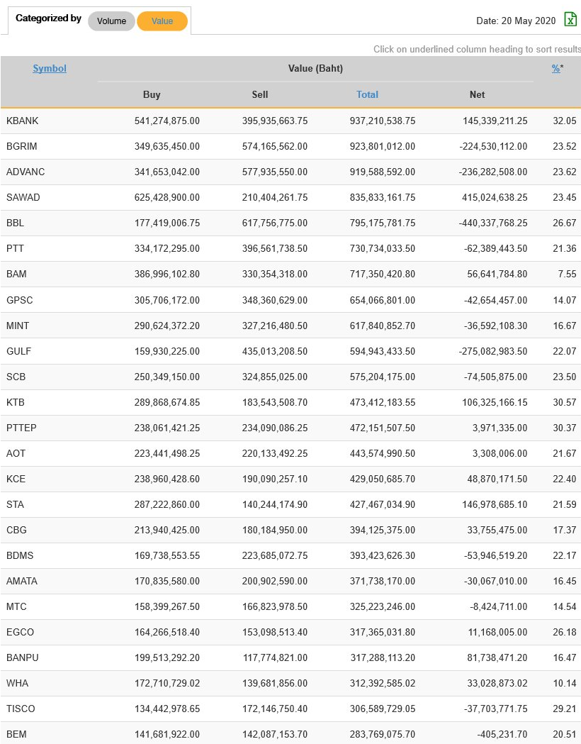 นักลงทุนต่างชาติ NVDR ซื้อ-ขาย มูลค่าสูงสุด 25 อันดับ 20/05/63