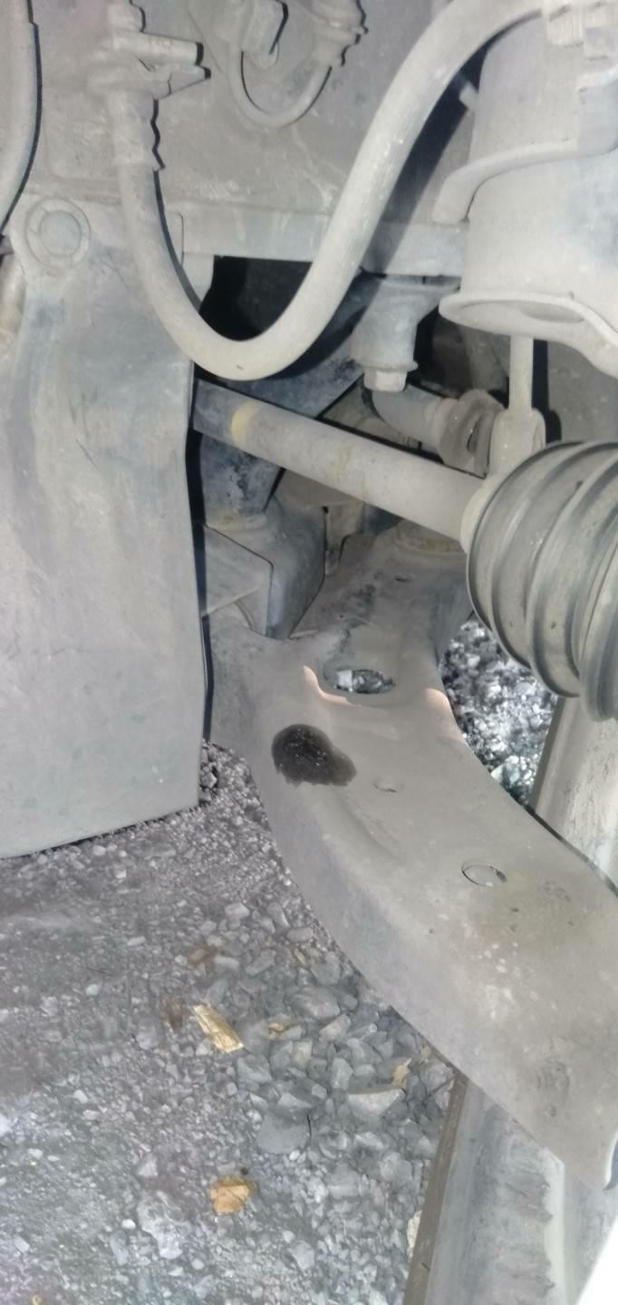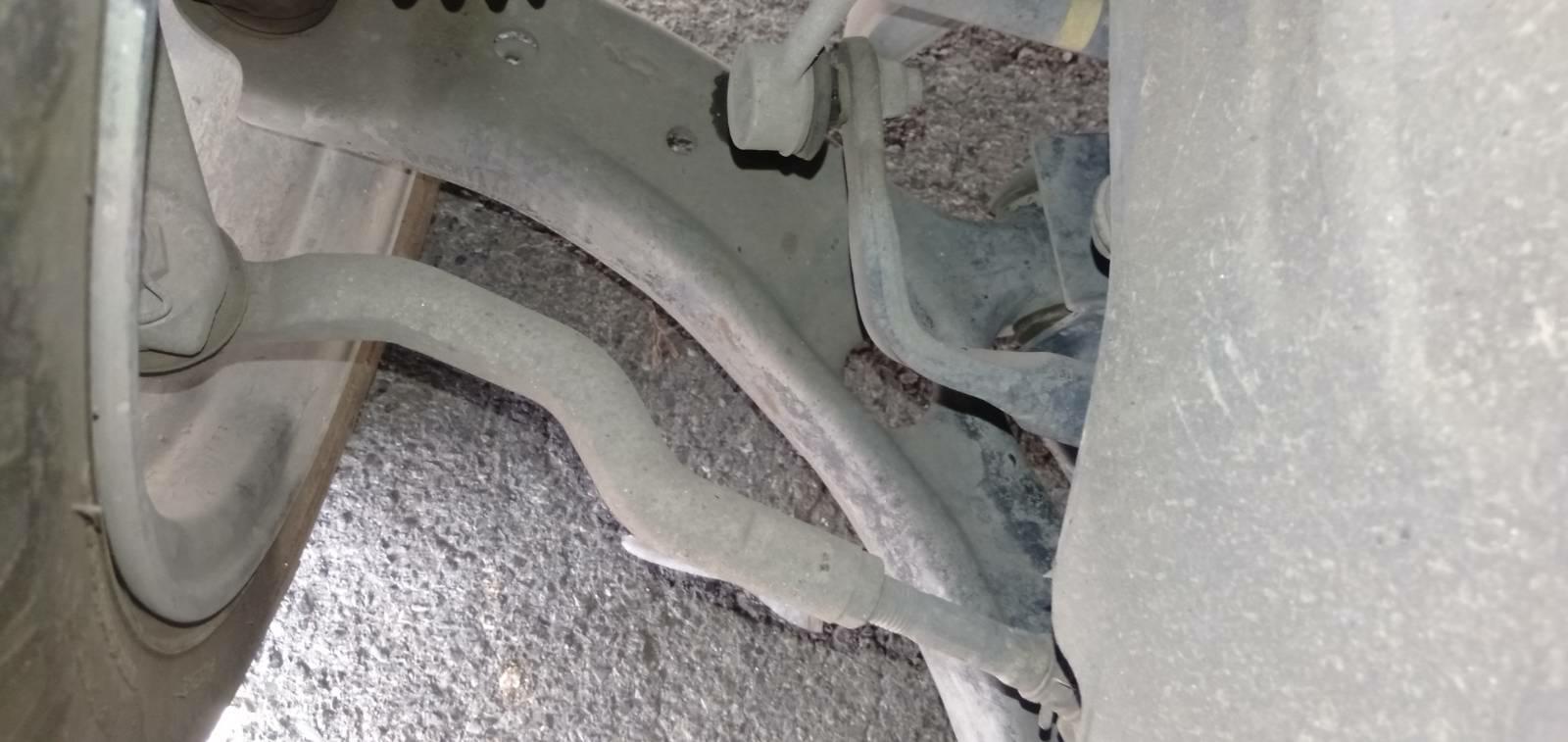รถกระบะ โดนชนบริเวณล้อหน้าขวา ทำให้กันโคลงบิดตัวเข้าหาปีกนกล่างจากเดิมประมาณ 1 นิ้ว