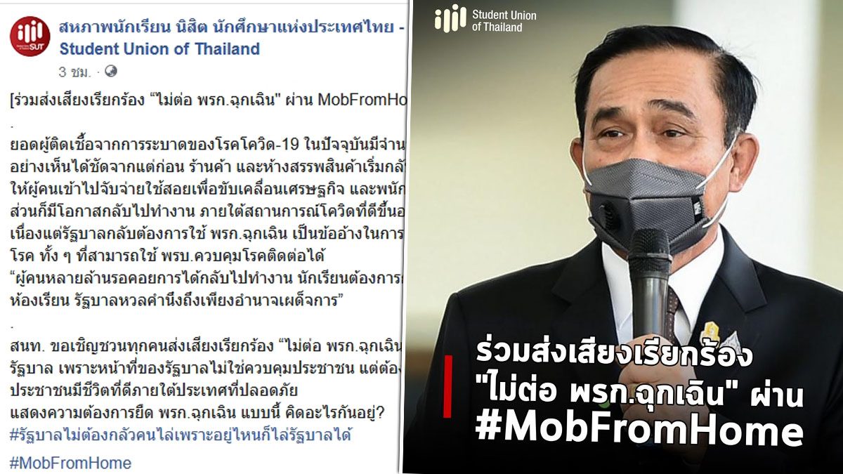 เมื่อวันที่ 21 พ.ค. เพจเฟซบุ๊ก สหภาพนักเรียน นิสิต นักศึกษาแห่งประเทศไทย - Student Union of Thailand โพสต์ข้อความรณรงค์ หัวข้อ ร่วมส่งเสียงเรียกร้อง "ไม่ต่อ พรก.ฉุกเฉิน" ผ่าน MobFromHome