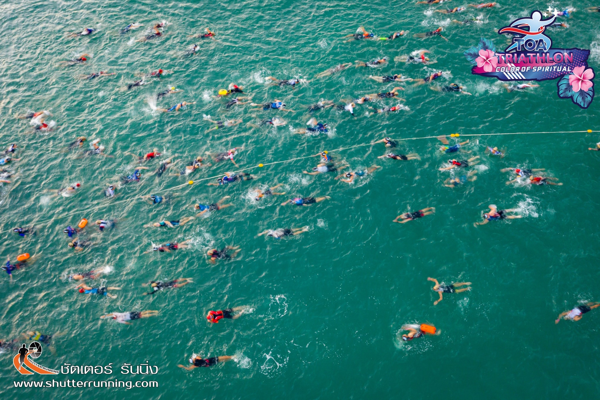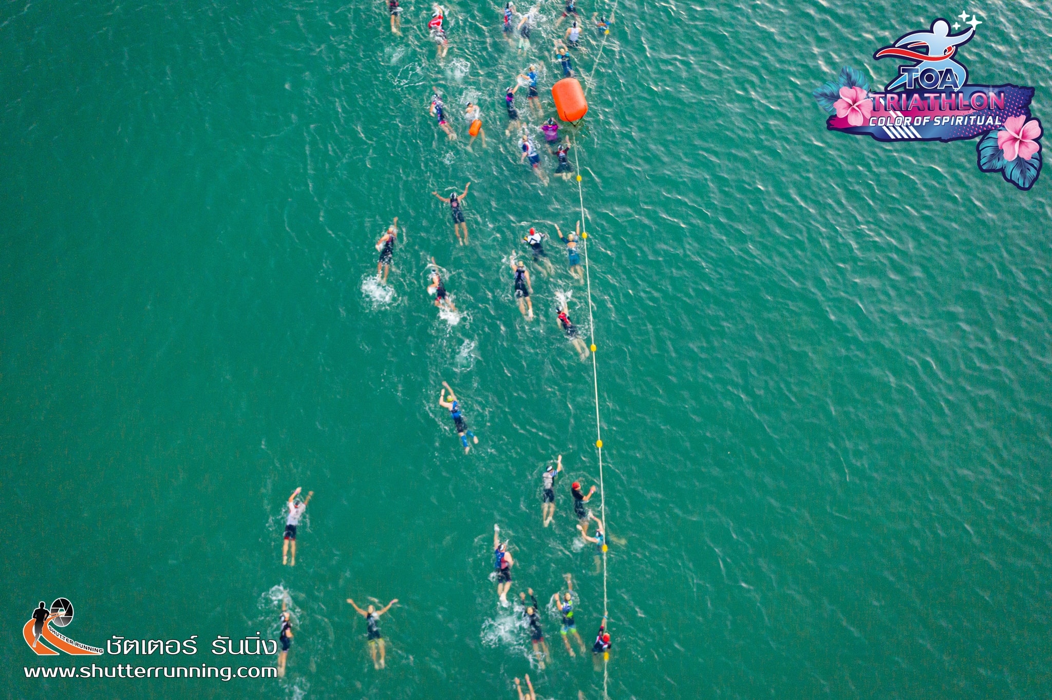 2) การว่ายน้ำที่ทุกคนกังวล เพราะเป็น Open Water เค้าจะมีหมวกว่ายน้ำสำหรับมือใหม่ให้ใส่ค่ะ เช่น หมวกสีขาว เค้าก็จะดูแลเราเป็นพิเศษหากเกิดอะไรขึ้น มีเรือหลายลำจ้องเราอยู่ อีกทั้งเรายังสามารถใส่ทุ่นช่วยลอยตัวไว้ที่ขา สำหรับผู้ที่ว่ายน้ำไม่แข็ง (บางสนามที่มีมาตรฐานระดับสากัล ถ้าใส่เค้าจะไม่ให้เราจบหรือ DNF ค่ะ)