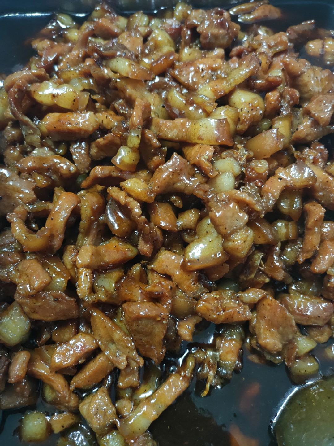 หั่นไว้ ผัดให้เข้าด้วยกัน ใส่น้ำตาลปิ๊บ ซีอิ้วดำหวาน