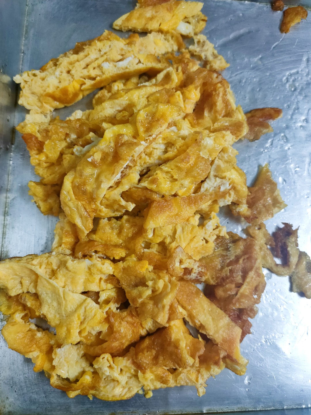 ขั้นตอนต่อมา ทอดไข่เจียวแล้วนำมาหั่นเป็นฝอยๆ