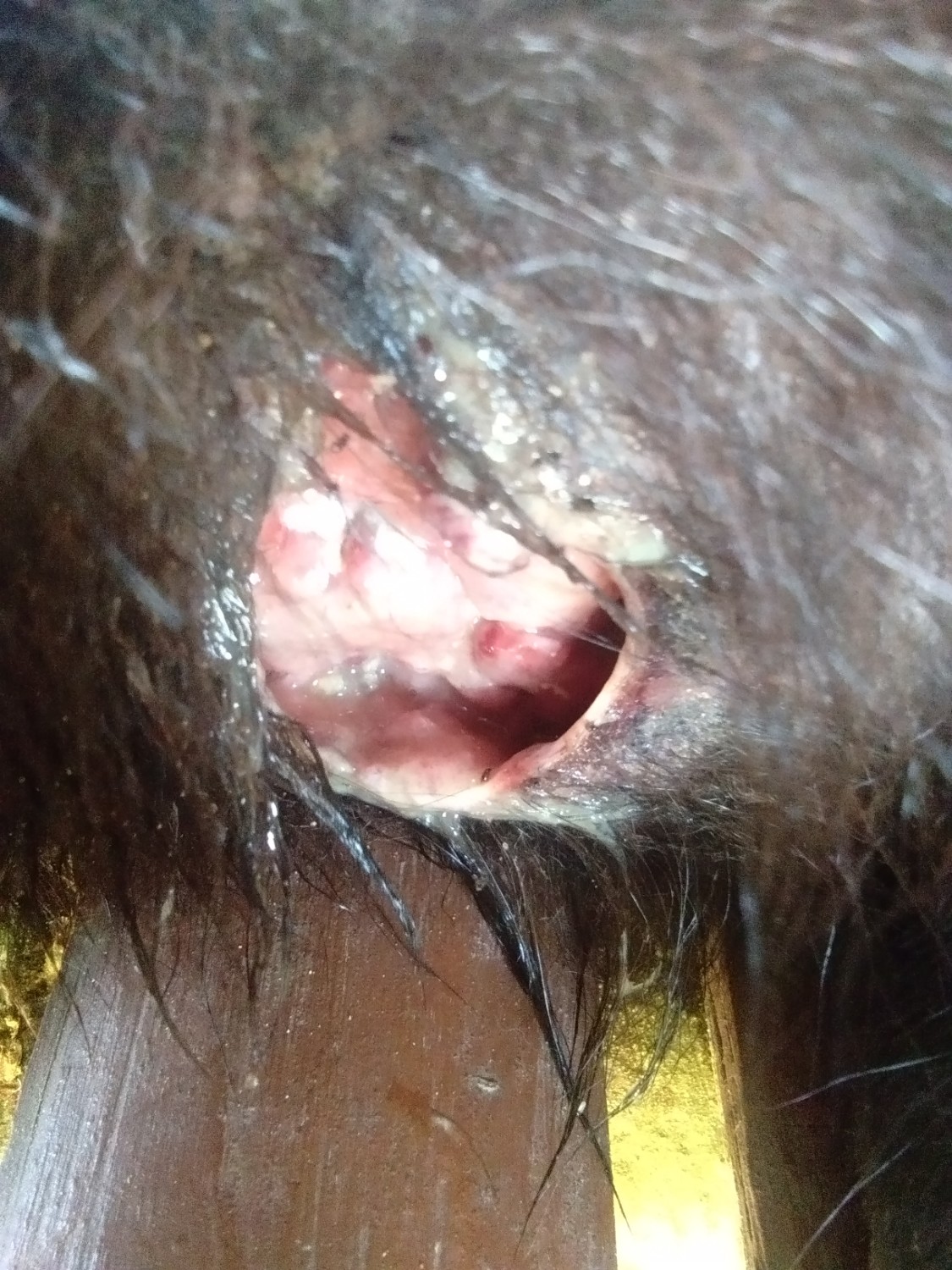 ตอนนี้น้องหมาซึ่งเป็นลูกของสุนัขจรจัดที่มาอาศัยที่บ้าน มีแผลเป็นรูตรงกลางหลัง ในแผลที่เป็นรูมีเหลวสีเหมือนเลือดหรือเบต้าดีนที่เราหยอดให้รึเปล่าก็ไม่รู้ขังอยู่ รูไม่ใหญ่มากแต่เหมือนจะกว้างกว่าเดิมเล็กน