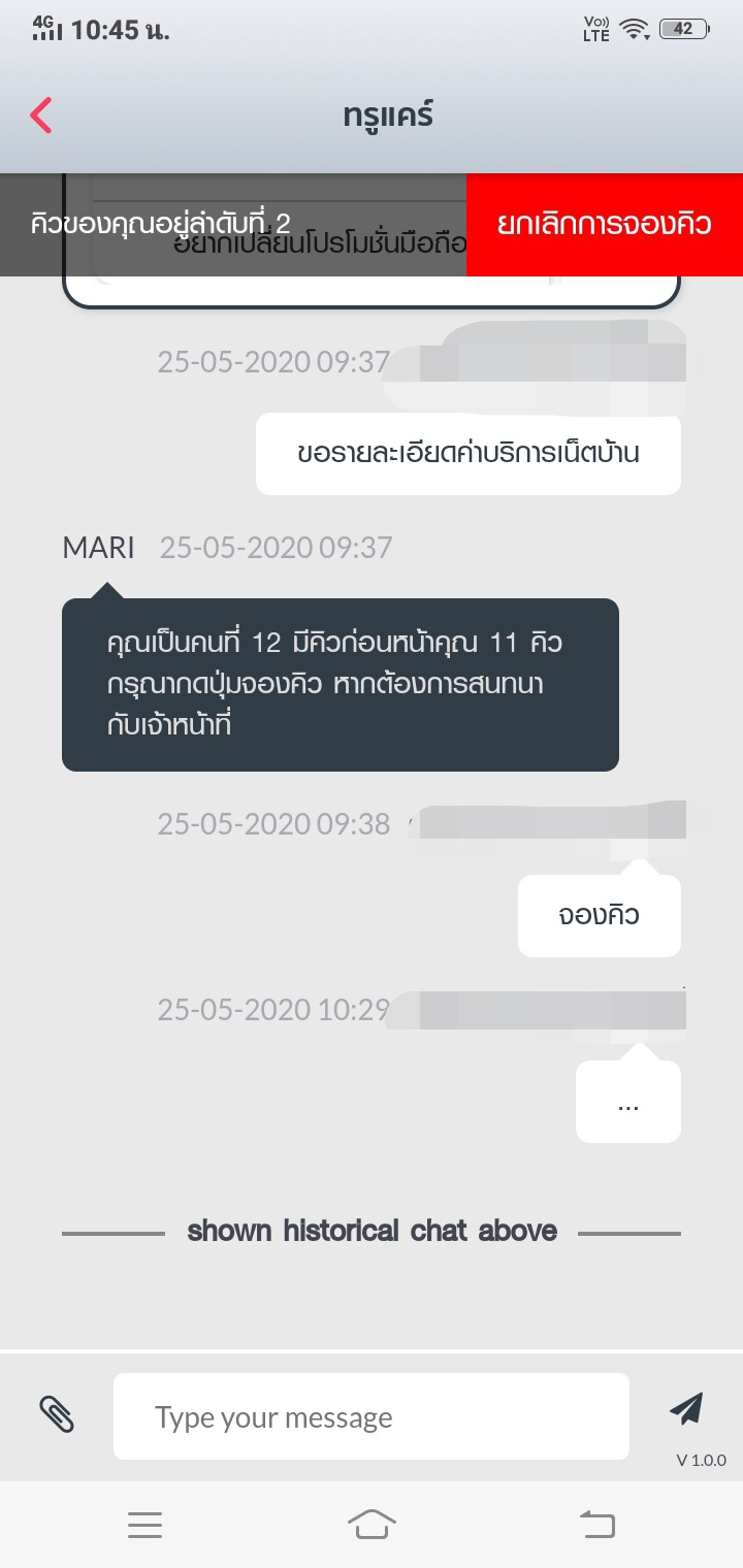 เดี๋ยวนี้ติดต่อเจ้าหน้าที่ทรูทีมีแต่คุยกับบอท ทรูไม่มีคนทำงานแล้วหรอครับ? TrueiService คุยกับมะลิว่าจะติดต่อเจ้าหน้าที่แล้วก็รอ แต่ก็ถูกเด้งออกจากช่องแชท พอถึงคิวก็กลับแชทเดิมที่ถูกเด้งออกมาไม่ได้ แย่