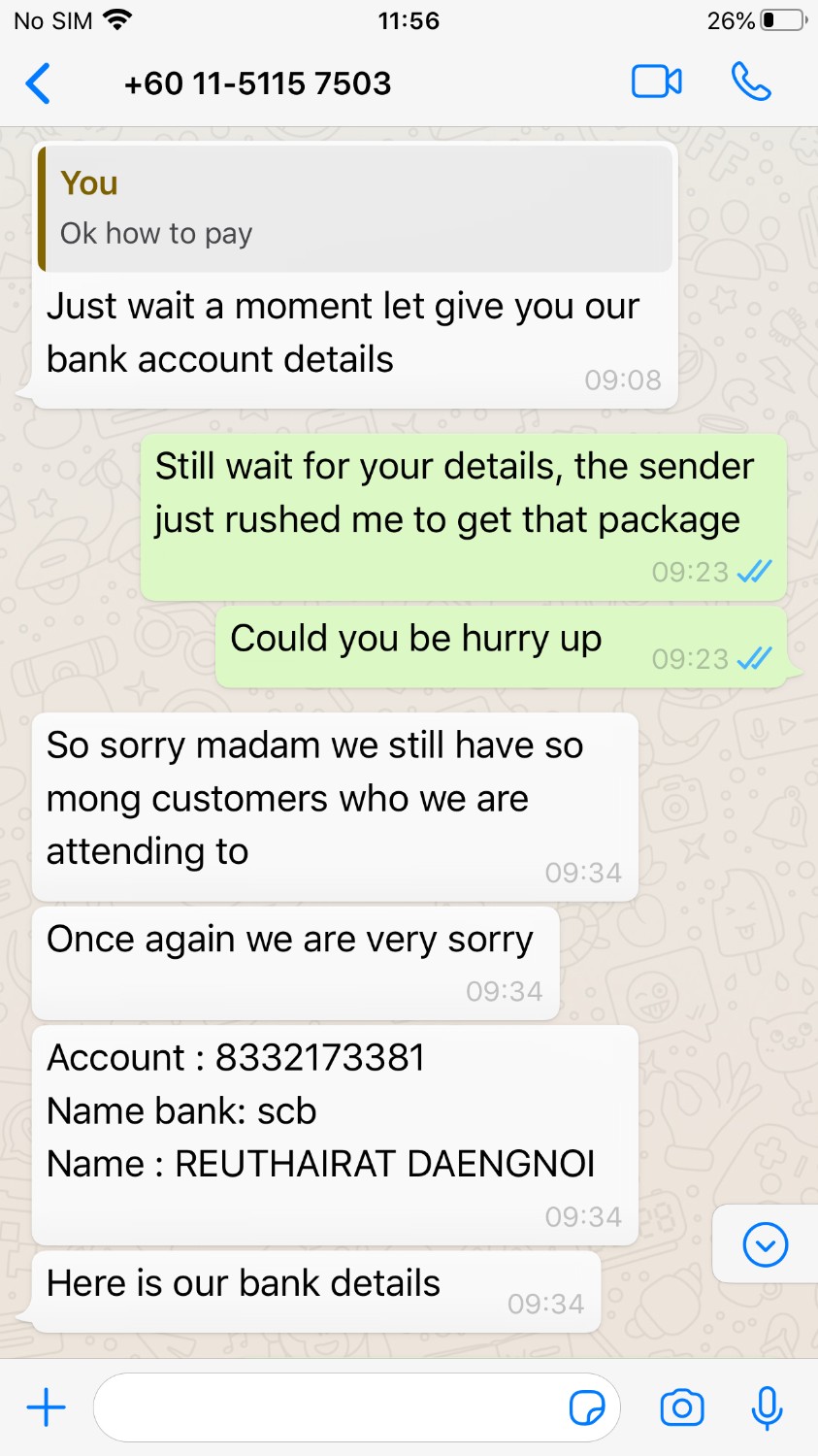 ในที่สุดก็ส่งช่องทางในการชำระเงินมาให้ โดยชื่อบัญชีเป็นคนไทย ธนาคารไทย และไม่ได้เป็นไปในรูปแบบของบริษัทแต่อย่างใด
