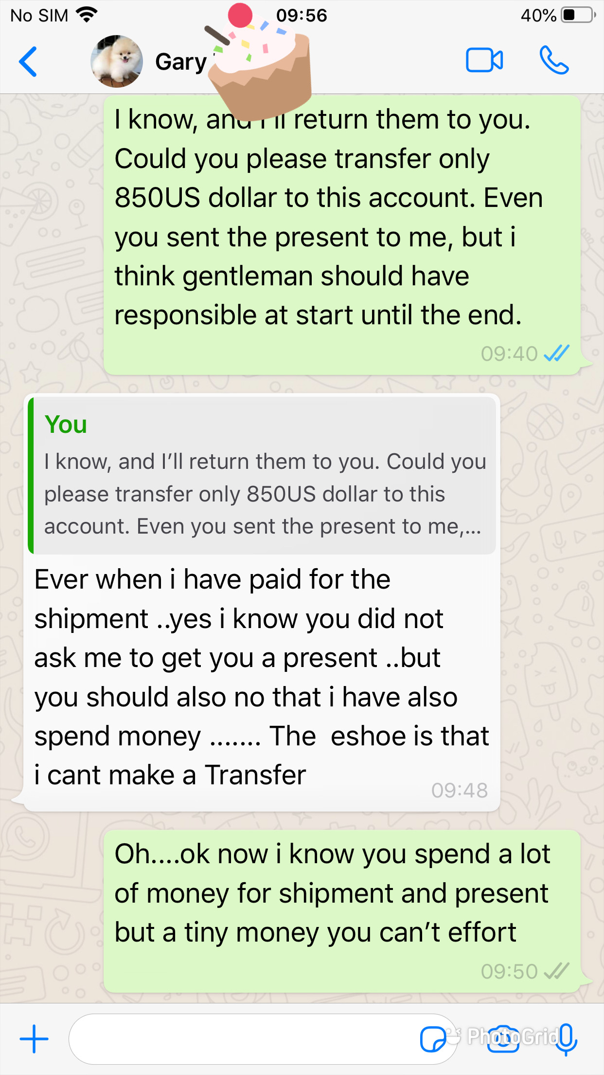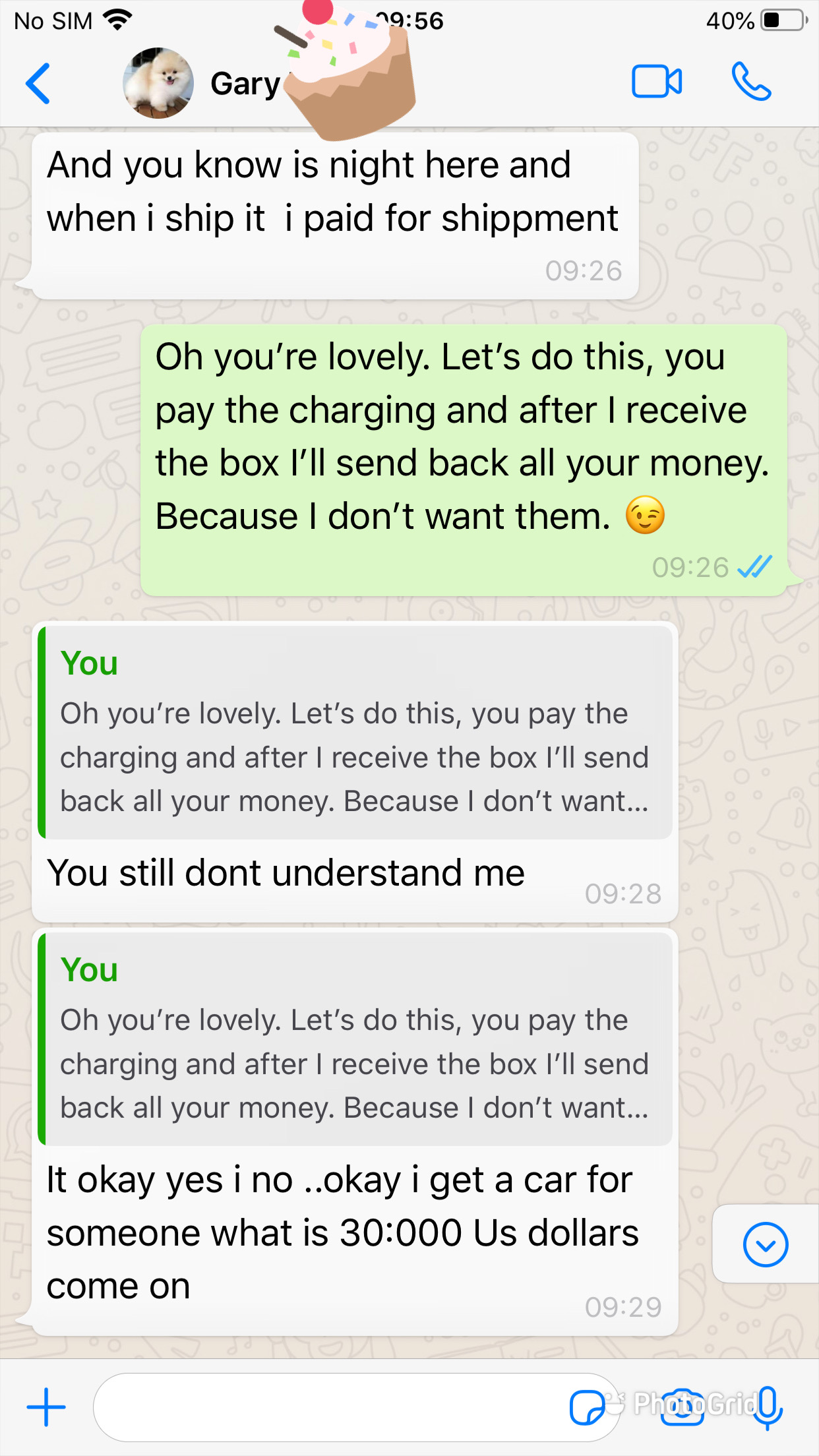สุดท้ายนางหาว่าฉันคุยไม่รู้เรื่อง นางก็บอกไปแล้วว่ามีเงินอยู่ในนั้น 30000ดอล ค่าส่งเขาก็จ่าย ค่าของขวัญเขาก็จ่าย ยังจะให้เขามาจ่ายค่าclearaceอะไรนั้นอีก