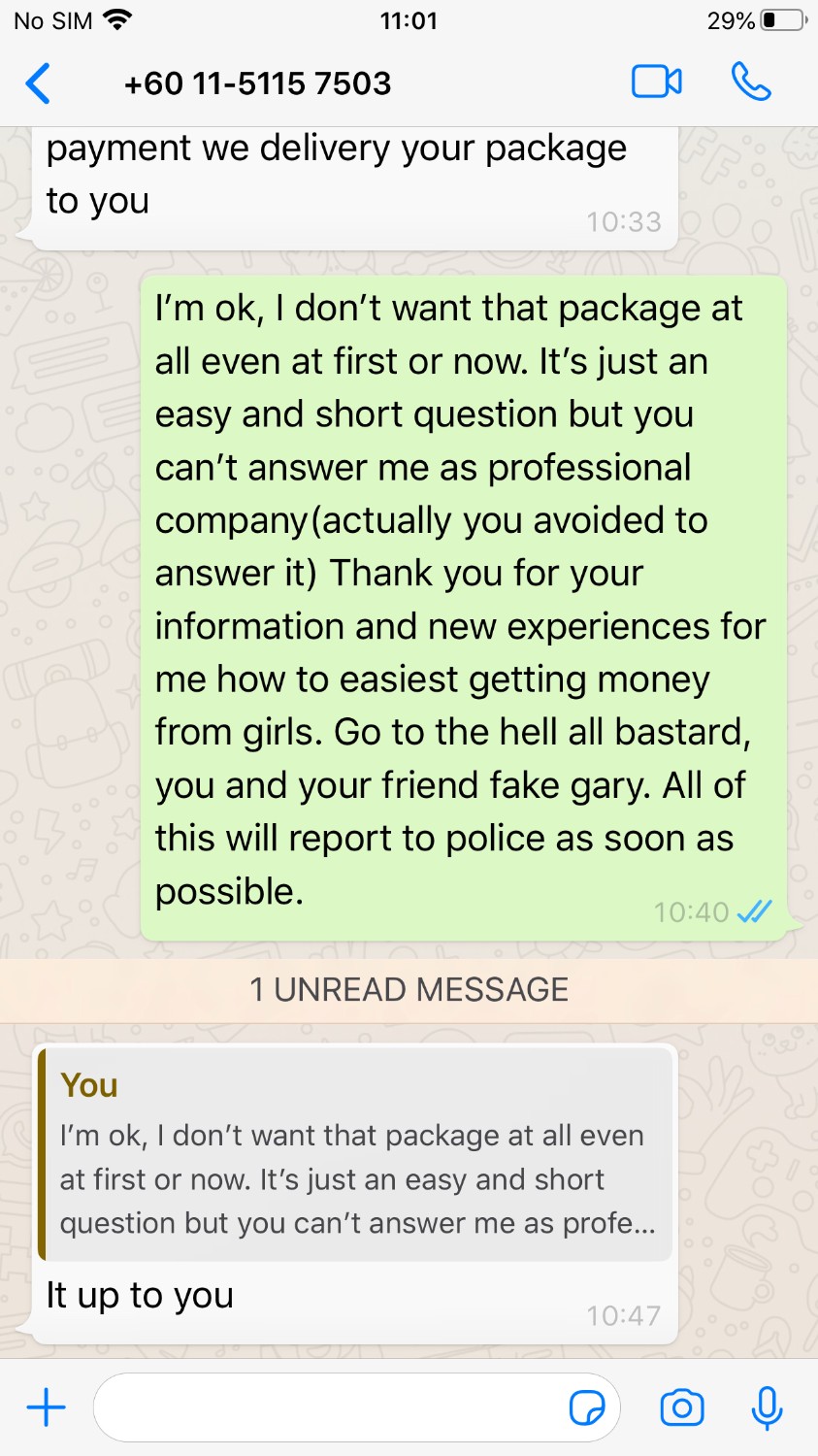 แต่เราก็คุยต่อไป ในใจก็คิดแล้วว่าสงสัยเจอมิจฉาชีพแน่ๆ เพราะเคยเห็นกระทู้ในพันทิพผ่านๆเกี่ยวกับเรื่องส่งมาไทย แล้วทางเราต้องจ่ายค่า clearace