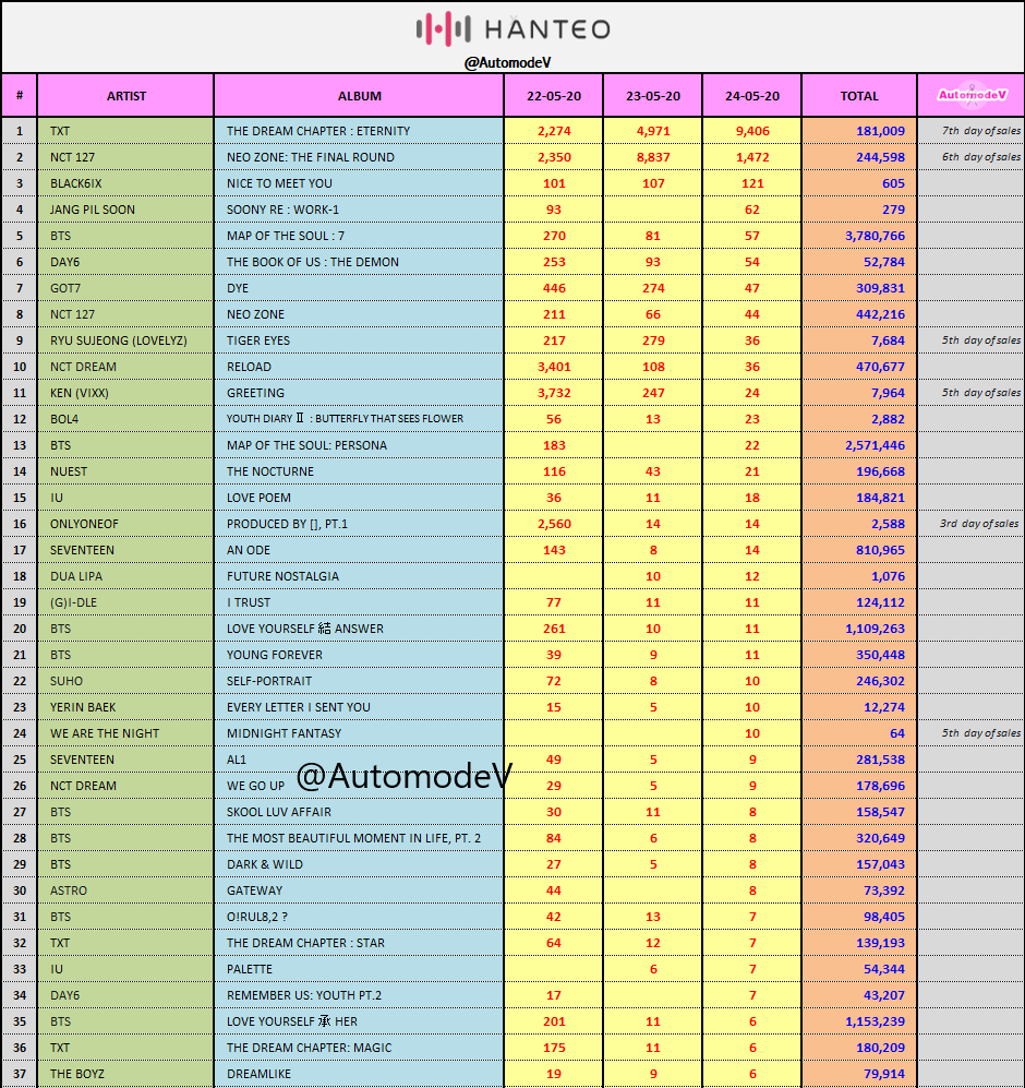 ยอดซื้ออัลบั้มจากชาร์ต HANTEO 22 - 24 พฤษภาคม 2563 + TxT