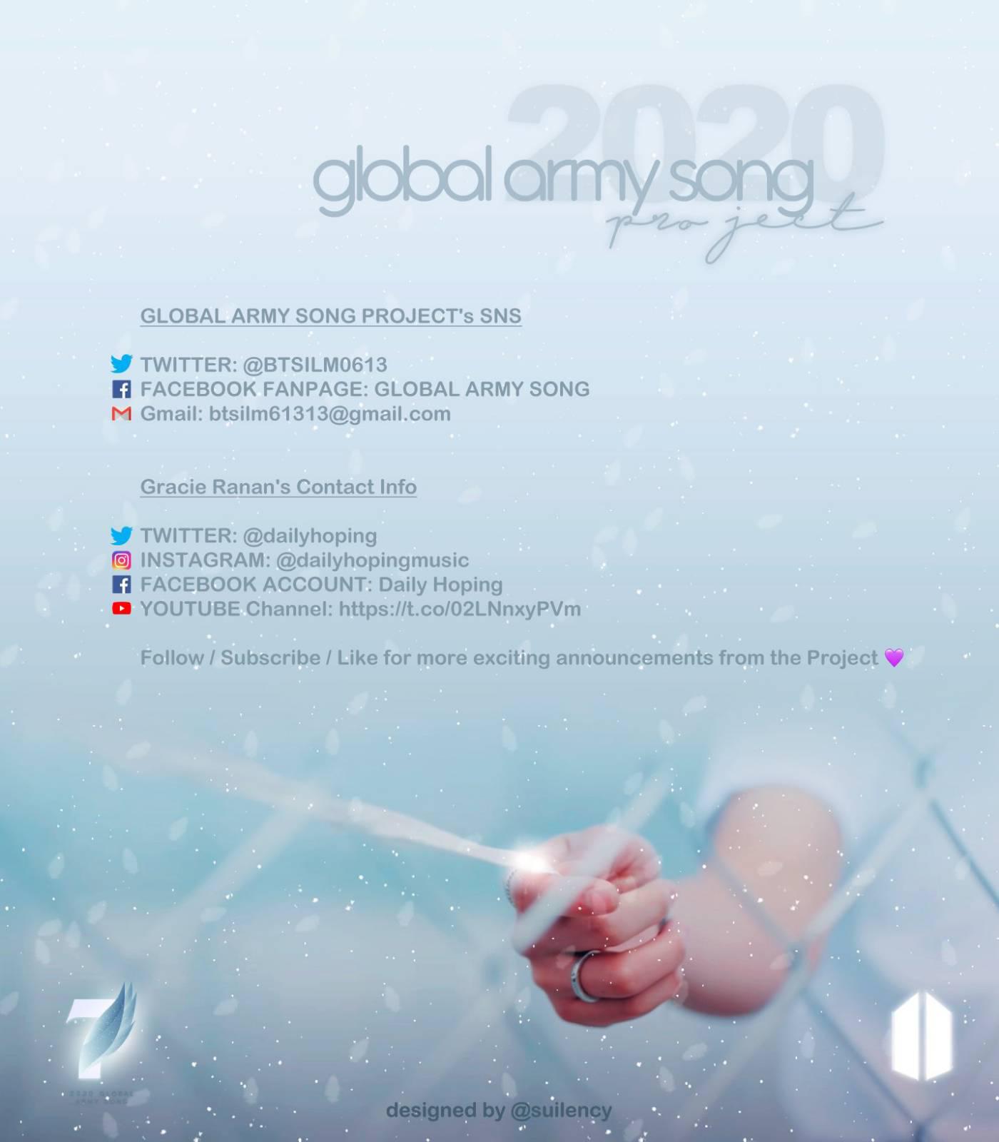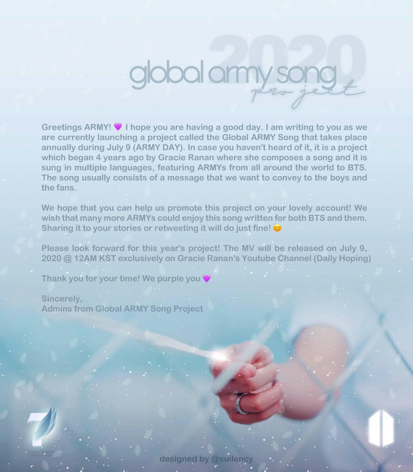 โปรเจกต์ 2020GlobalArmySong เพลงของอาร์มี่จากทั่วโลก ที่ได้มาร้องร่วมกันหลายภาษา โดยในเนื้อเพลง จะสื่อถึง บังทัน และแฟนๆ จะเปิดตัววันที่ 9 กรกฎาคม 22.00(เวลาไทย)