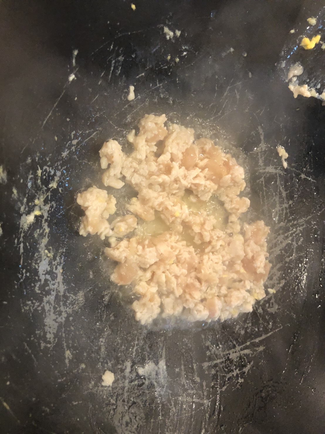 ตั้งกระทะใส่น้ำมันพอร้อน ใส่ไข่ไก่ลงผัดให้สุก ตักขึ้นพักไว้