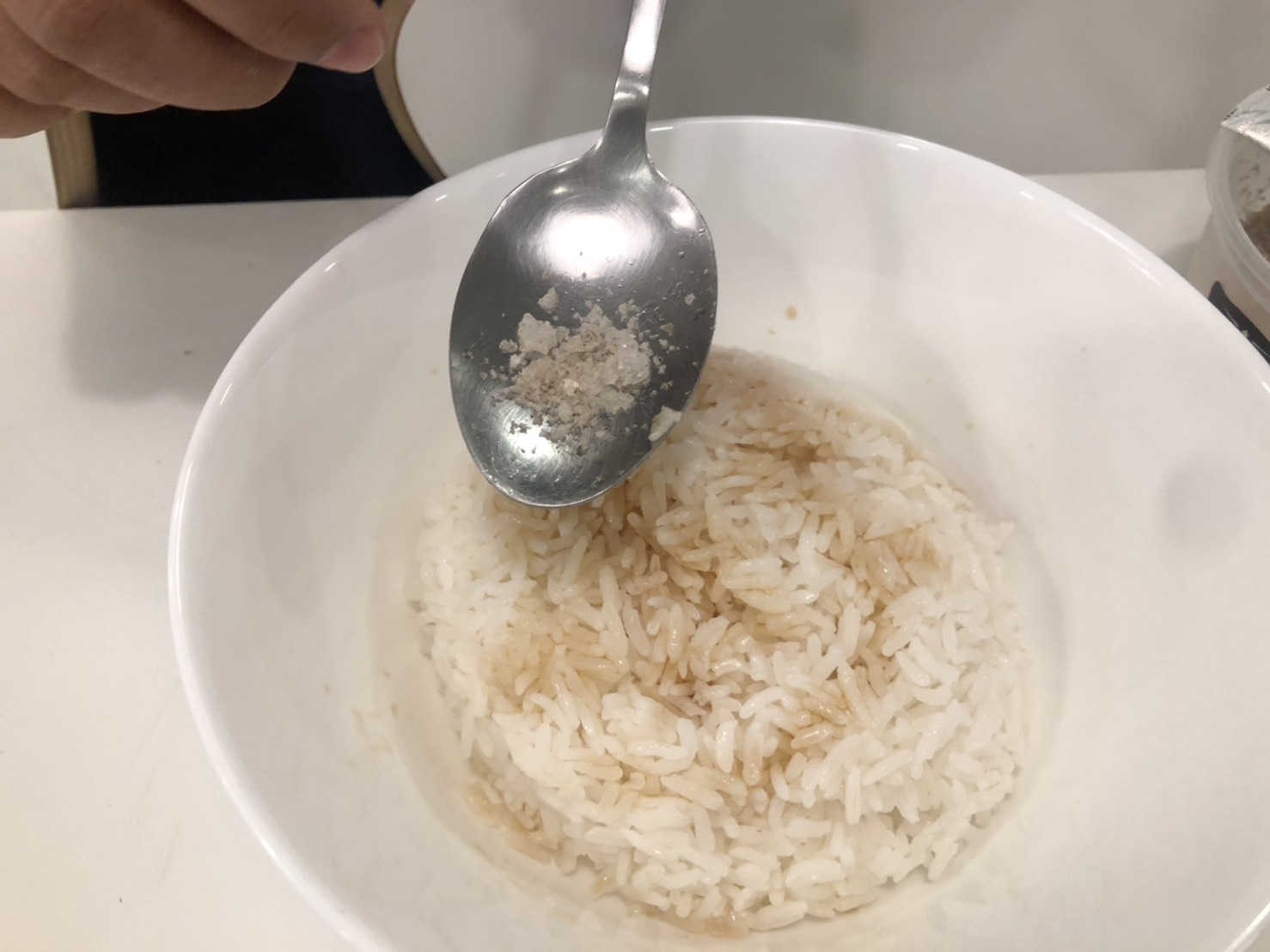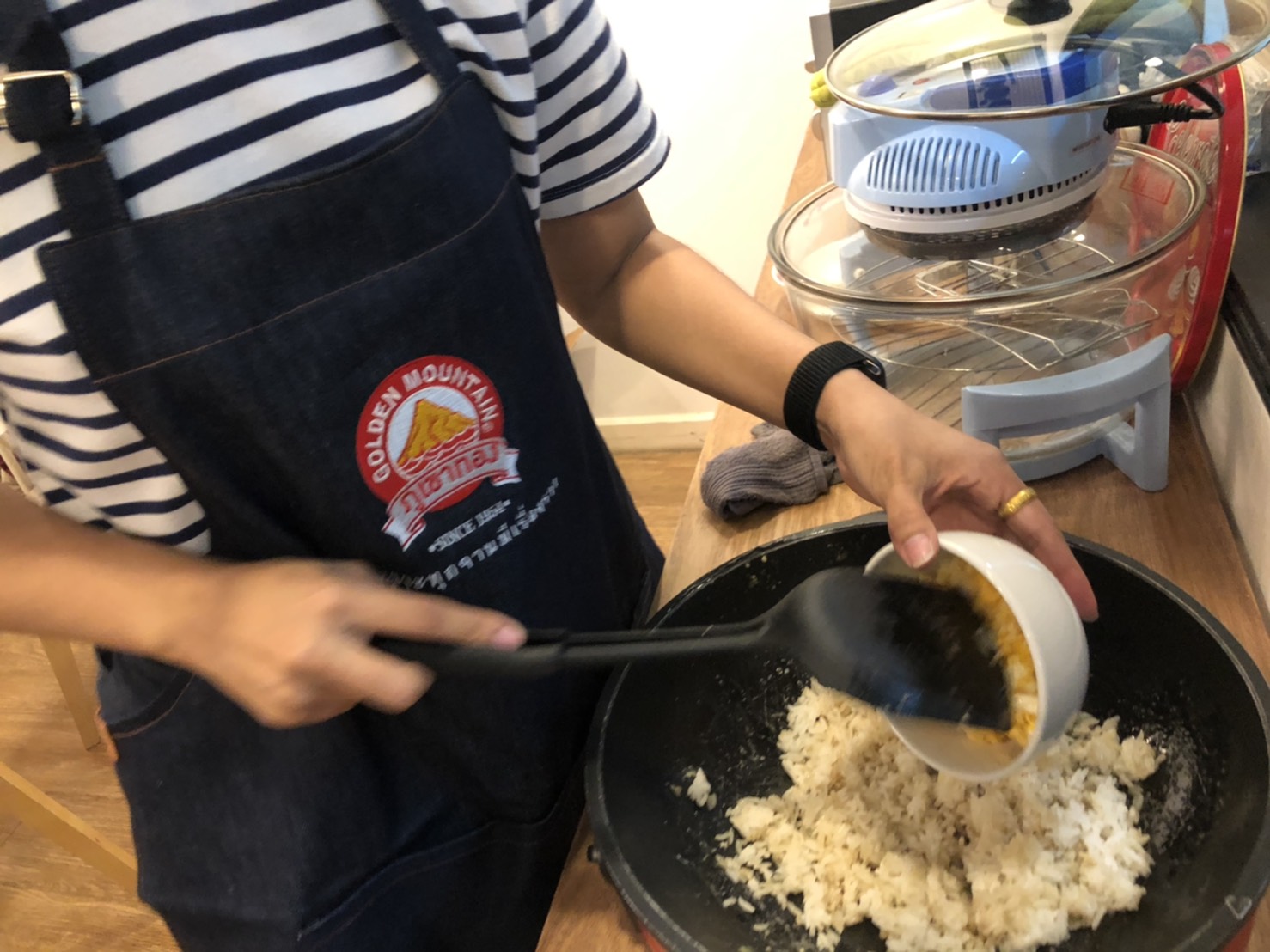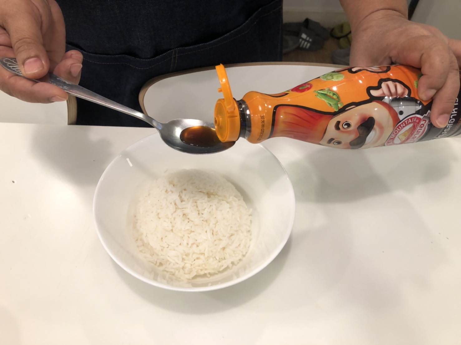 ปรุงรสข้าวด้วย ซอสปรุงรสอาหารฝาส้ม ตราภูเขาทอง เกลือ และพริกไทย คลุกเคล้าให้ส่วนผสมเข้ากัน