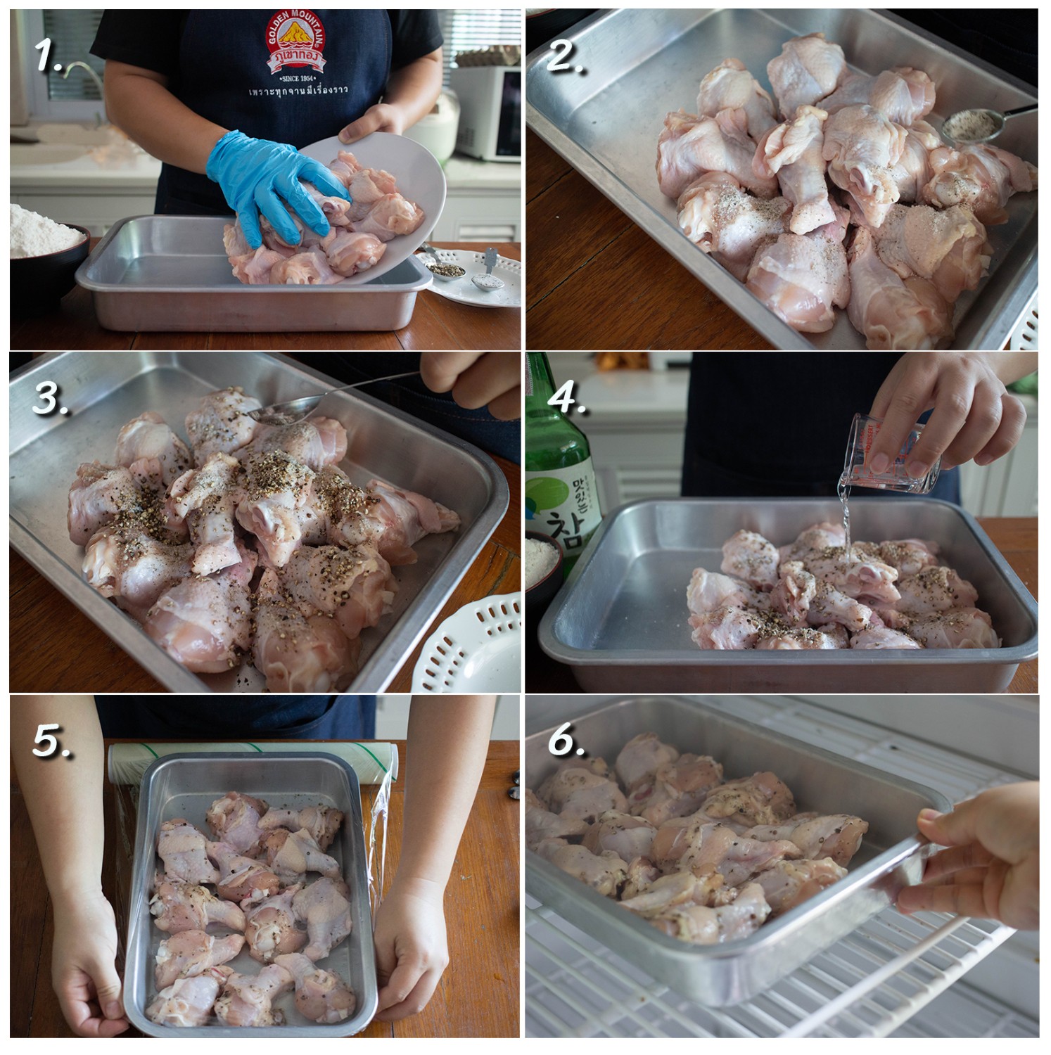 2. หมักไก่ด้วยเกลือ, พริกไทย และเหล้าโชจู 30 มล.