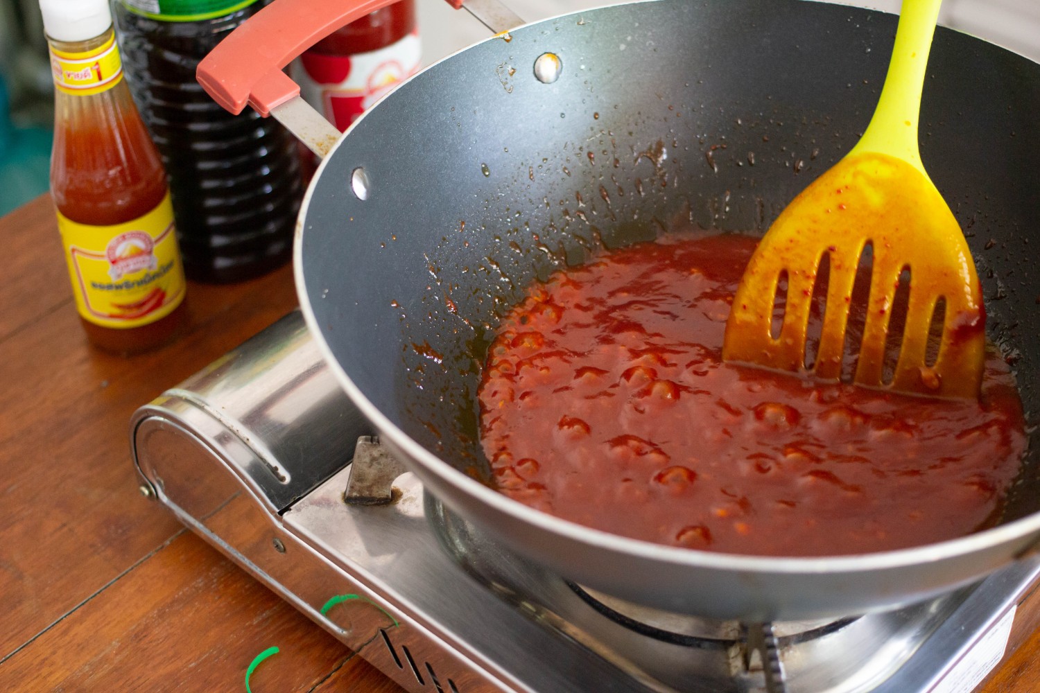 2. ใส่ซอสมะเขือเทศ ซอสพริก น้ำส้มสายชู ซอสถั่วเหลือง น้ำมันงาและน้ำเปล่าลงไปตามลำดับแล้วคนให้เข้ากัน (ขั้นตอนนี้ใช้ไฟอ่อนค่อนกลาง)