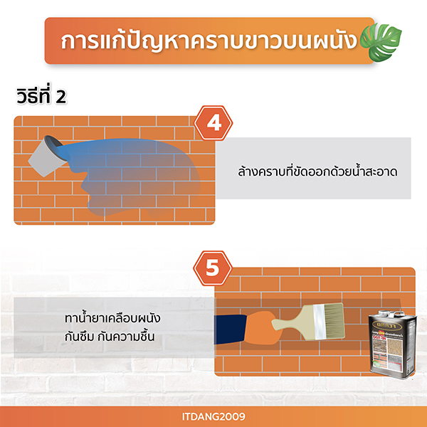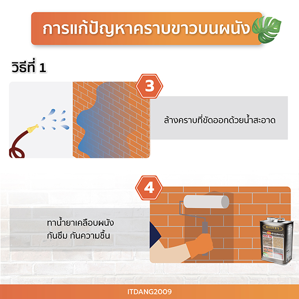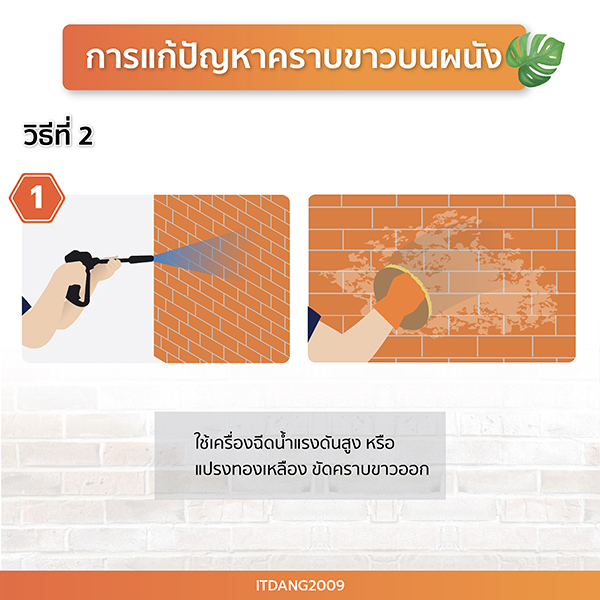 วิธีที่ 1 ใช้เครื่องฉีดน้ำแรงดันสูงฉีดไล่คราบขาวบนผนัง และใช้แปรงทองเหลืองขัดคราบขาวออก ล้างด้วยน้ำสะอาด รอให้ผนังแห้ง แล้วเคลือบผนังด้วยน้ำยากันซึม กันความชื้น และตะไคร่น้ำ