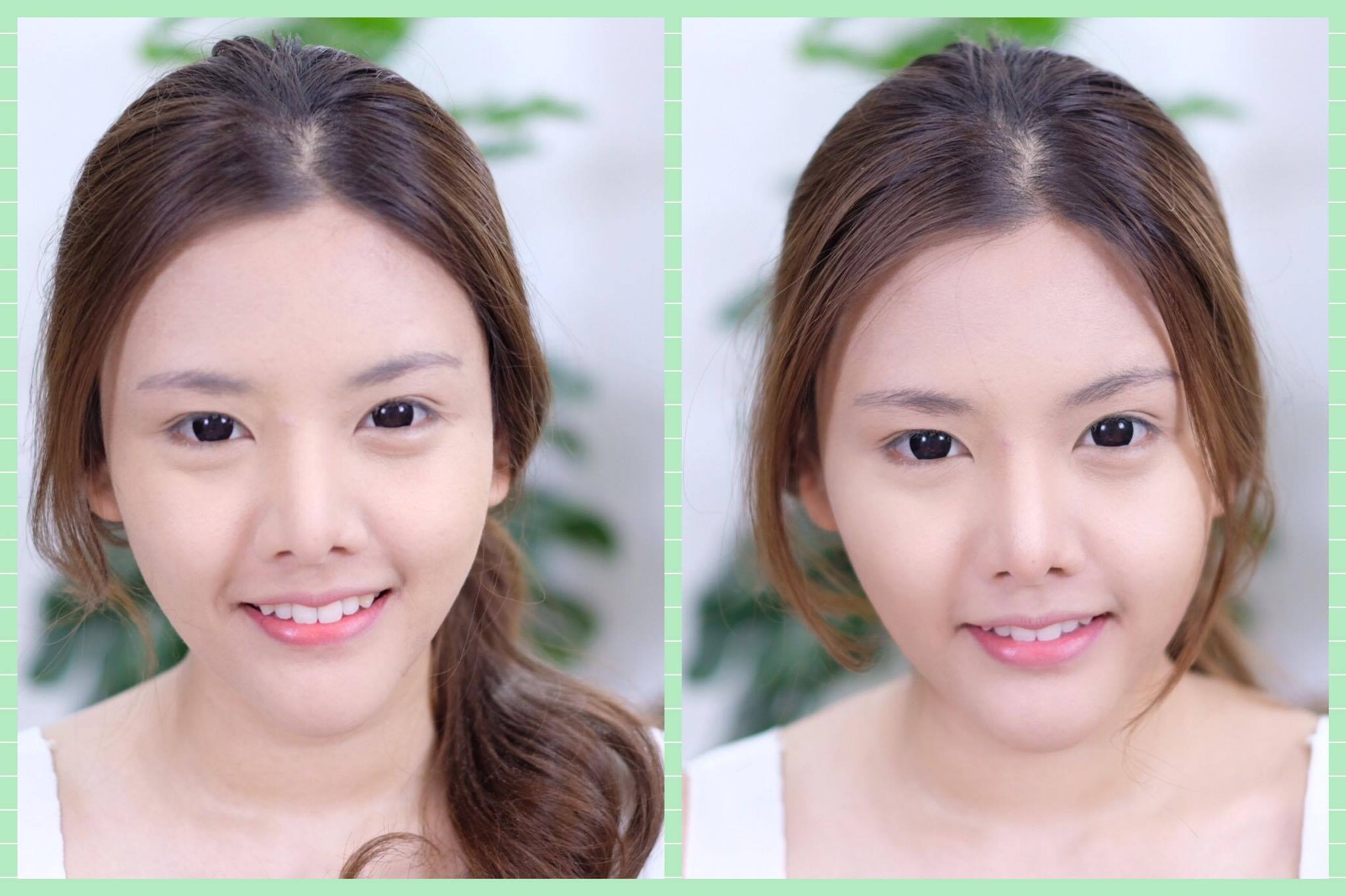 ด้านซ้ายคือหลังทาแป้งฝุ่นเสร็จ ด้านขวาคือหลังจากลงแป้งผสมรองพื้น แสงต่างกันเล็กน้อย แต่จะเห็นได้เลยว่าด้านขวาผิวดูมีการปกปิดมากขึ้น หน้าดูแน่นขึ้นอีก 1 ระดับ กรอบหน้าและสันจมูกดูชัดขึ้นจากการที่เราลงเบอร์สีเข้มเป็นเฉดดิ้ง โดยที่ยังมีความเป็นธรรมชาติอยู่ ไม่หนา ไม่ดูปลอมดูโป๊ะ