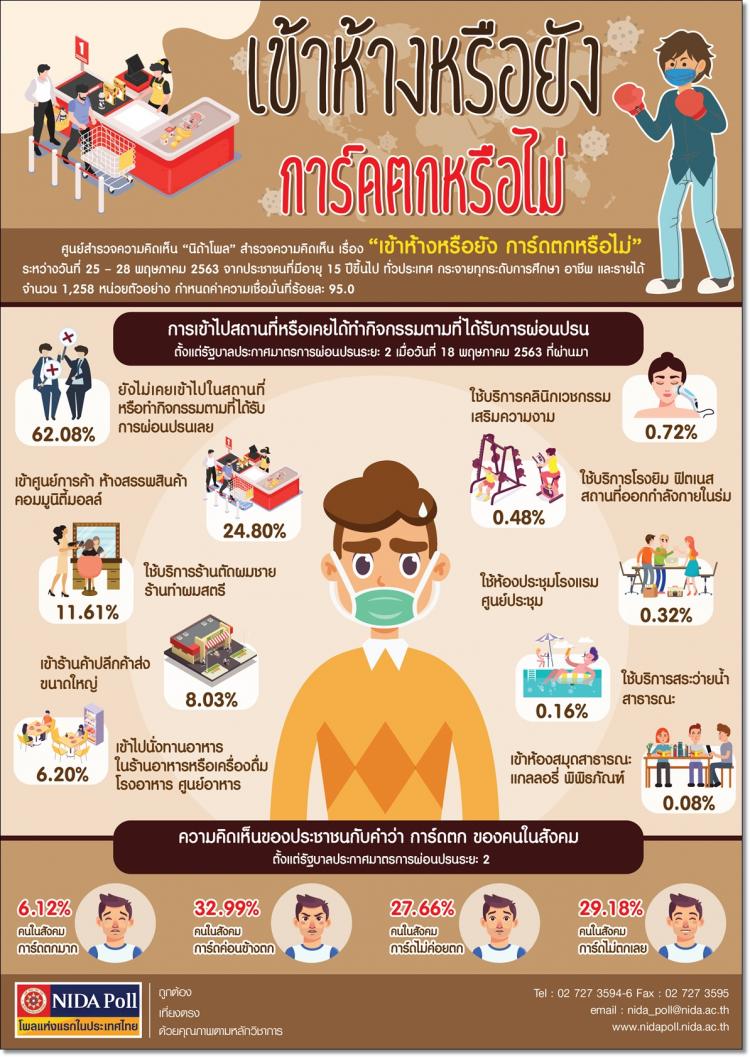 วันที่ 31 พ.ค.63 ศูนย์สำรวจความคิดเห็น “นิด้าโพล” สถาบันบัณฑิตพัฒนบริหารศาสตร์ (นิด้า) เปิดเผยผลสำรวจของประชาชน เรื่อง “เข้าห้างหรือยัง การ์ดตกหรือไม่” ทำการสำรวจระหว่างวันที่ 25 – 28 พฤษภาคม 2563 จากประชาชนที่มีอายุ 15 ปีขึ้นไป กระจายทุกภูมิภาค ระดับการศึกษา และอาชีพทั่วประเทศ รวมทั้งสิ้น จำนวน 1,258 หน่วยตัวอย่าง เกี่ยวกับการประกาศมาตรการผ่อนปรนระยะ 2 เมื่อวันที่ 18 พฤษภาคม 2563 ที่ผ่านมา การสำรวจอาศัยการสุ่มตัวอย่างโดยใช้ความน่าจะเป็นจากบัญชีรายชื่อฐานข้อมูลตัวอย่างหลัก (Master Sample) ของ “นิด้าโพล” สุ่มตัวอย่างด้วยวิธีแบบง่าย (Simple Random Sampling) เก็บข้อมูลด้วยวิธีการสัมภาษณ์ทางโทรศัพท์โดยกำหนดค่าความเชื่อมั่นที่ร้อยละ 95.0 โดยผลสำรวจมีดังนี้