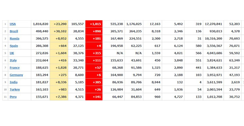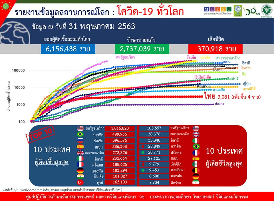 พญ.พรรณประภากล่าวว่า ขณะที่สถานการณ์ทั่วโลก มีผู้ป่วยยืนยันมากกว่า 6.1 ล้านคน เป็นผู้ป่วยรายใหม่ 1.2 แสนราย เสียชีวิตมากกว่า 4,000 ราย เสียชีวิตรวม 3.7 แสนราย สหรัฐอเมริกายังคงเป็นอันดับ 1 คือ มีผู้ป่วย 1.8 ล้านราย เสียชีวิต 1.05 แสนราย สำหรับประเทศไทยตกอันดับจาก 77 มาที่ 78 ของโลก ขณะที่ฝั่งเอเชียประเทศที่พบผู้ป่วยต่อเนื่องคือ อินเดีย ปากีสถาน บังกลาเทศ สิงคโปร์ อินโดนีเซีย และฟิลิปปินส์ ที่น่าสนใจ คือ พม่า มีผู้ติดเชื้อรายใหม่ถึง 17 ราย ต้องจับตามองต่อไป
