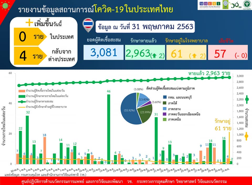 รายงานข้อมูลสถานการณ์การติดเชื้อโควิด-19 ณ วันอาทิตย์ที่ 31 พฤษภาคม 2563