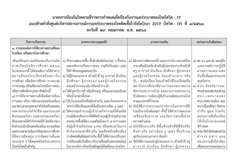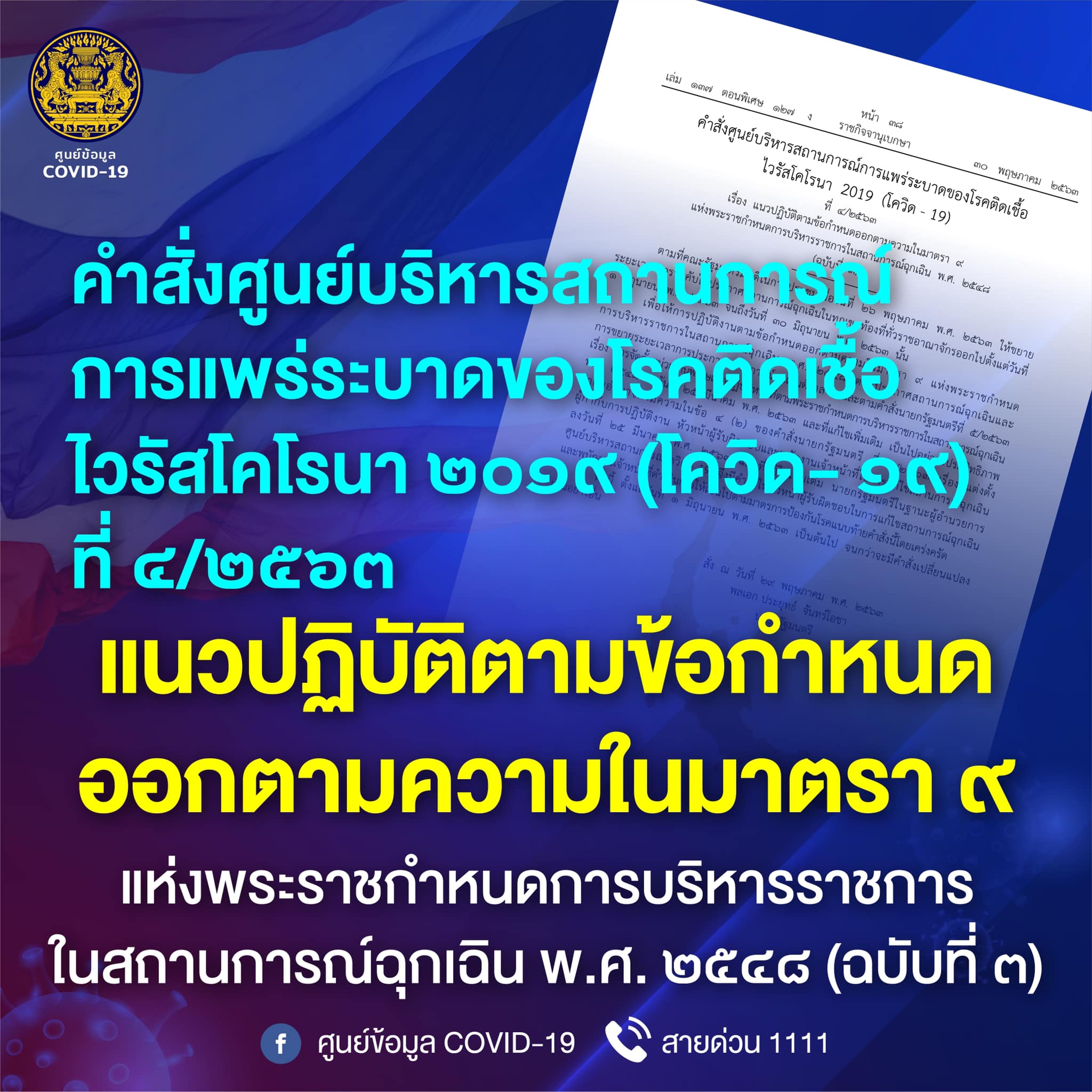 คำสั่งศูนย์บริหารสถานการณ์การแพร่ระบาดของโรคติดเชื้อไวรัสโคโรนา ๒๐๑๙ (โควิด- ๑๙) ที่ ๔/๒๕๖๓ เรื่อง แนวปฏิบัติตามข้อกำหนดออกตามความในมาตรา ๙ แห่งพระราชกำหนดการบริหารราชการในสถานการณ์ฉุกเฉิน พ.ศ. ๒๕๔๘ (ฉบับที่ ๓)