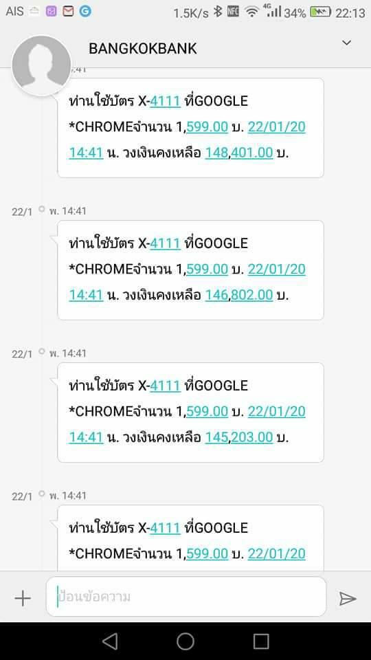 เนื่องจากเราใช้บัตรเครดิตธนาคารดังใบสีแดงที่มีปัญหาเรื่องแฮกกันเยอะ เราเลยโดนกับตัว อยู่ก็โดยบัตรแจ้งตัดยอดเหมือนกันติดกันสี่ครั้งรวมๆกันประมาณ 6000กว่าบาท