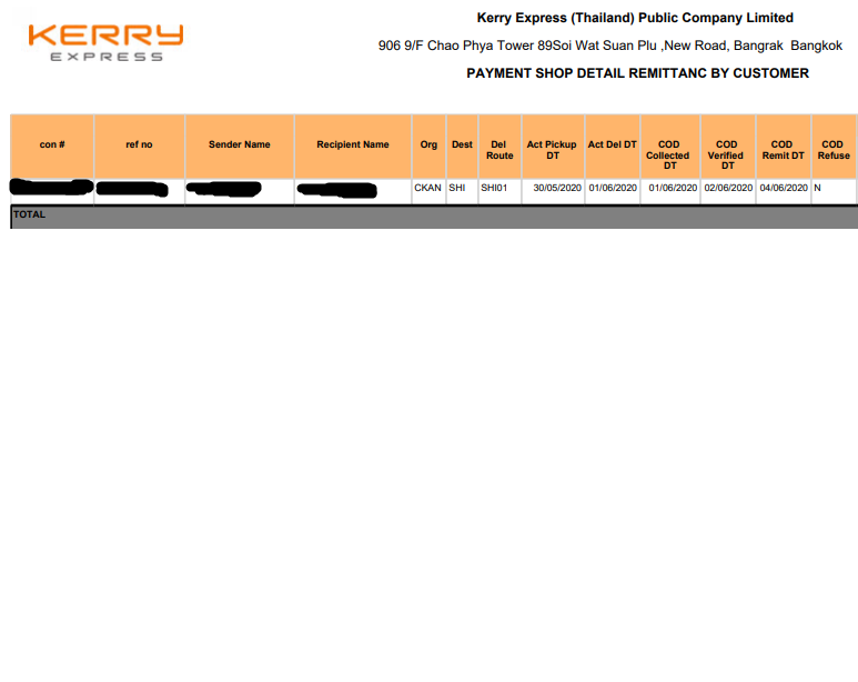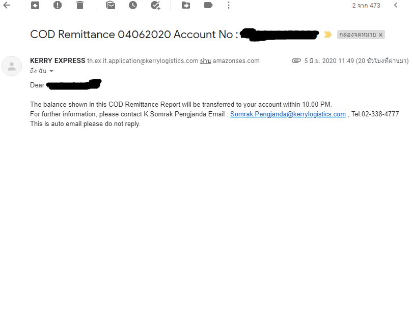 สืบเนื่องจากได้ทำการเก็บเงินปลายทางกับ บริษัท kerry แล้ว บริษัท ได้ email จาก บริษัท kerry แจ้งมาว่าเงินจะเข้าภายเวลา 10.00 pm นั้นก็คือ 22.00 น.ในวันนั้นๆ แต่ บริษัท kerry นั้นไม่เคยโอนเงินตรงเวลา ซักครั้ง ซึ่งตรงนี้ ผมซึ่งเป็นลูกค้าของท่านเสียความรู้สึกเป็นอย่างมาก ซึ่งไม่ใช่แค่ครั้งเดียว นับตั้งแต่ผมเปิดบริการ COD มาก็ใช้บริการ 4-5 ครั้ง เป็นแบบนี้ทุกครั้ง แต่ครั้ง ล่าสุด ใน email แจ้ง 4/6/20 จะนำเงินเข้าบัญชีให้ จน ณ บัดนี้ 7.48 น. วันนี้ 6/6/20 ก็ยังไม่มีรายการโอนเงินเข้ามา