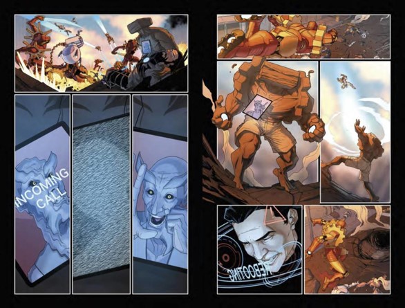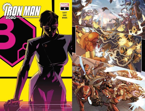 Iron Man 2020 #4 เหล่าจักรกลยังไม่ทันได้อาลัยให้ศพของโทนี่นานนัก อาร์โนไม่ปล่อยโอกาสให้เสียเปล่ารีบยิงถล่มพวกมันทันที แต่แล้วก็มีสายเรียกเข้ามาที่แมชชีนสมิธ เขาดีใจรีบบอกแอนดี้ให้พาเขาเผ่นลงใต้ดิน