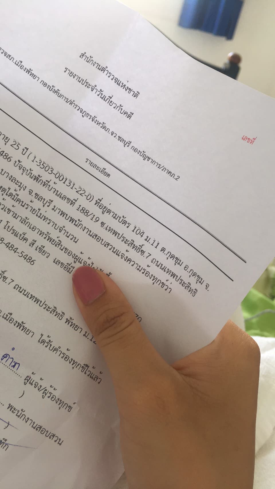 แล้วหลังจากนั้นเขาขอเลขบัตรประชาชนของผมไป แต่พอลองโทรไปถาม สภ.พัทยาเบอร์ 038 420 804 ผมบอกเขาไปว่าวันนี้มีคนมาแจ้งความเรื่องเกี่ยวกับมีคนเอารถมาให้รื้อแล้วกลัวว่าจะเป็นรถโดนขโมยมา หรือคดีเกียวกับอะไรประมาณนี้ไหม สรุปว่าไม่มีคนไปแจ้งความครับ