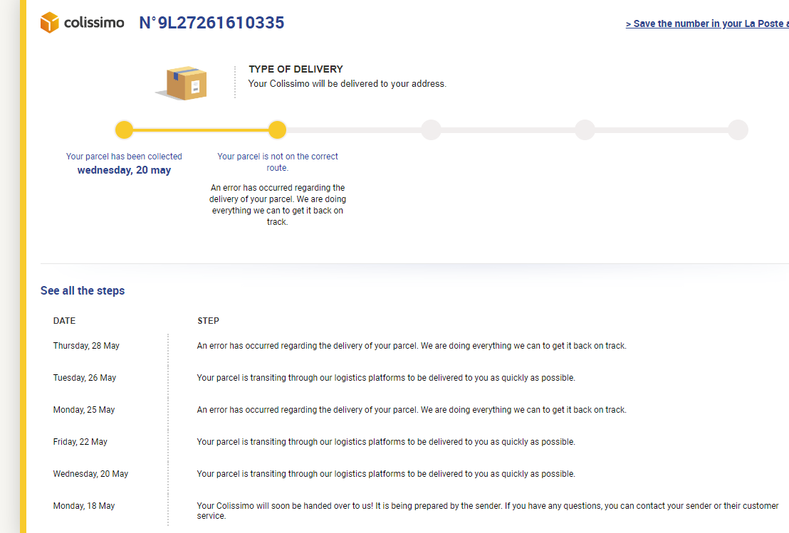 เนื่องจากสั่งของจากฝรั่งเศสแล้วตั้งแต่วันที่ 18 พฤษภาคม ผ่านไปเกือบจะเดือนแล้วของยังไม่ถึง แล้วไปเช็คสถานะใน Colissimo แล้วขึ้นรายละเอียดดังภาพด้า
