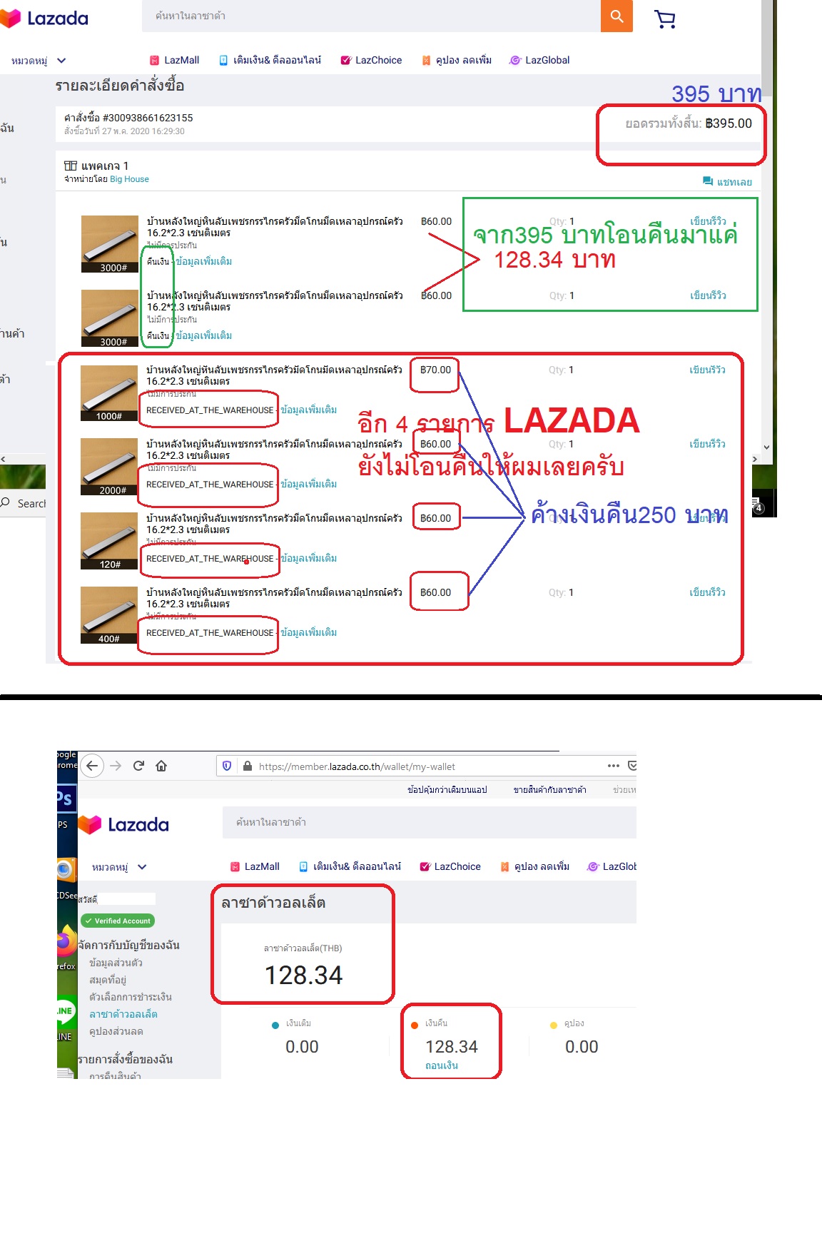 LAZADA คืนเงินไม่ครบ จ่ายไป 395 บาท คืนมาแค่128.34 บาท ++Web LAZADA ไม่ช่วยเหลือเลยมีแต่หุ่นยนต์ตอบ เซ็ง
