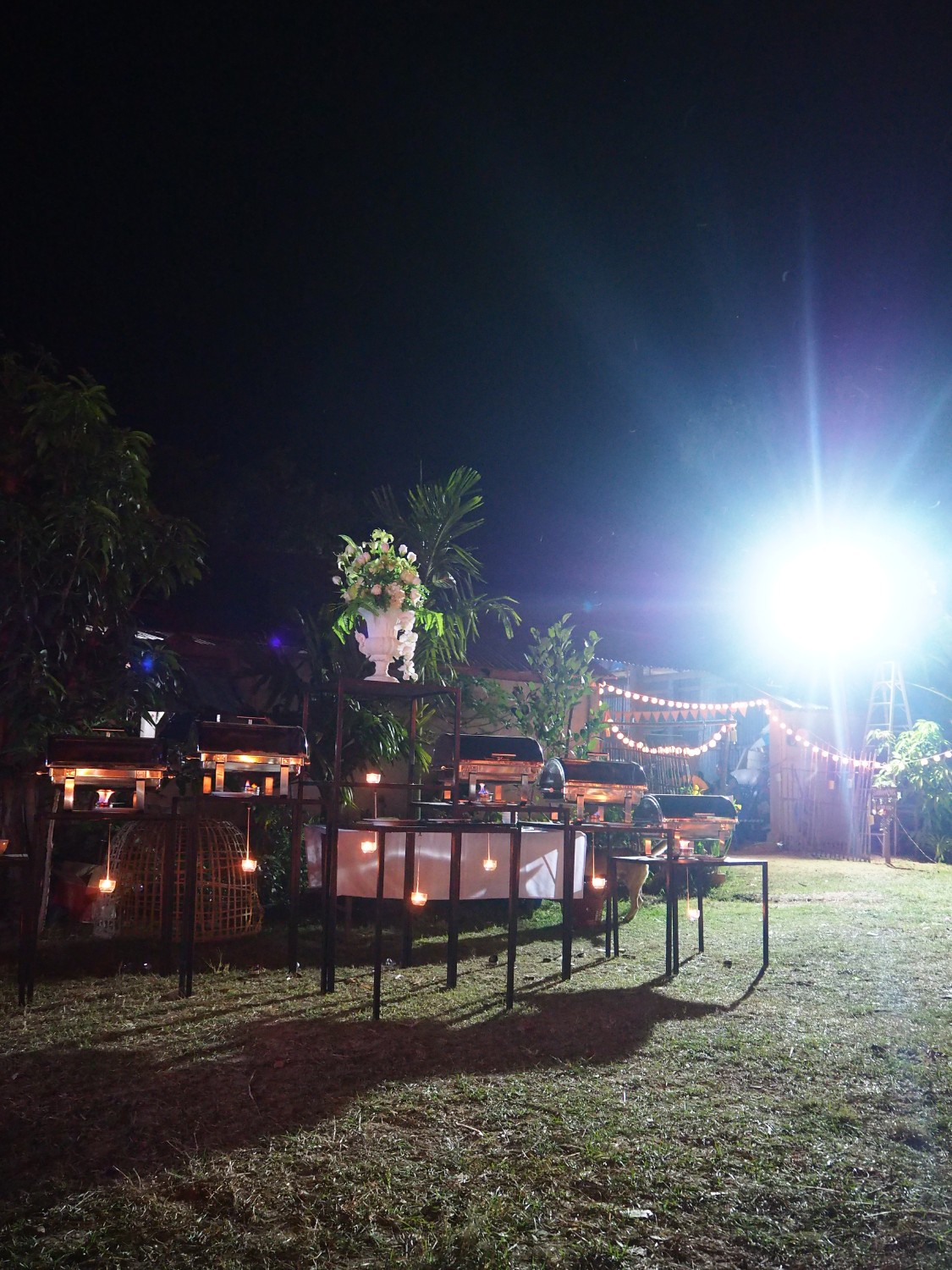 มุมอาหารจัดเลี้ยง งานตกแต่งเทียน ดอกไม้ สุ่มไก่เกร๋ๆ รวมกันในบรรยากาศดูสวยโรแมนติกเลยล่ะค่ะ